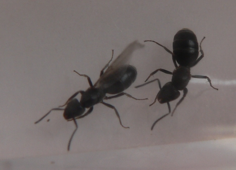 Una delle due regine era alata in fila con le operaie, mio fratello l'ha presa e si è dealata, l'altra invece, quella nella quale si vedono i monconi era sola e aveva delle ali, ho delle foto poi le posto, e adesso non ne ha ma si vedono quelle protuberanze, purtroppo non avendole qui non posso accertarmi di tante cose, comunque vedremo.