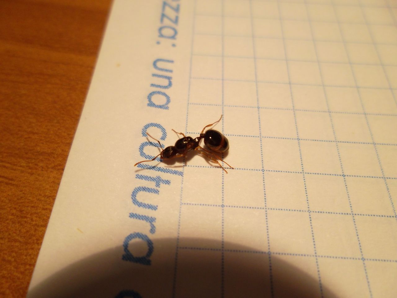 Dalla spina propodeale che s'intravede e dalla testa più allungata escludo con buona sicurezza Pheidole e mi verrebbe da dire Tetramorium le dimensioni tornerebbero, anche se il periodo è sicuramente molto tardo per T. caespitum (ma non so i tempi di sciamatura delle altre specie e ce ne sono sicuramente più autunnali, se è rossastra come sembra potrebbe essere un indizio di questo fatto). Una foto ripresa dall'alto in cui si vede meglio la zona delle spine aiuterebbe..