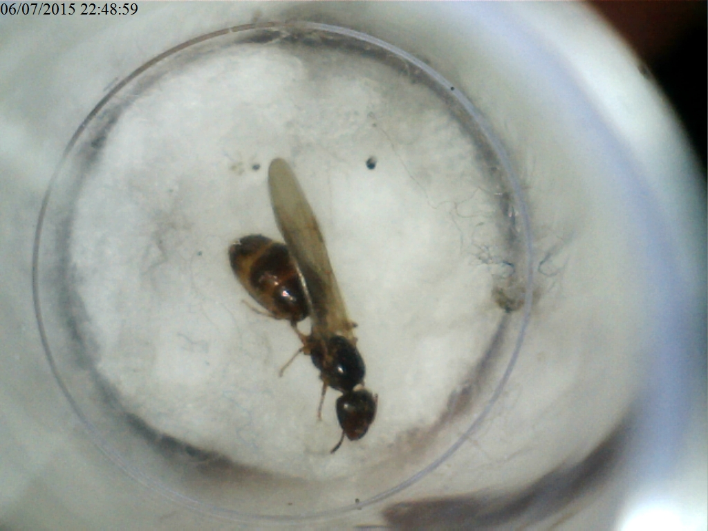 Sono appena tornato su da caccia ed ho trovato un'altra regina, che però non so cosa sia (Pheidole pallidula o Tetramorium caespitum ). è ancora alata, ma a distanza di una ventina di centimetri si trovava un maschio... forse sono stato fortunato! Il cielo è sereno, ci sono 30 C (si muore!!!!!