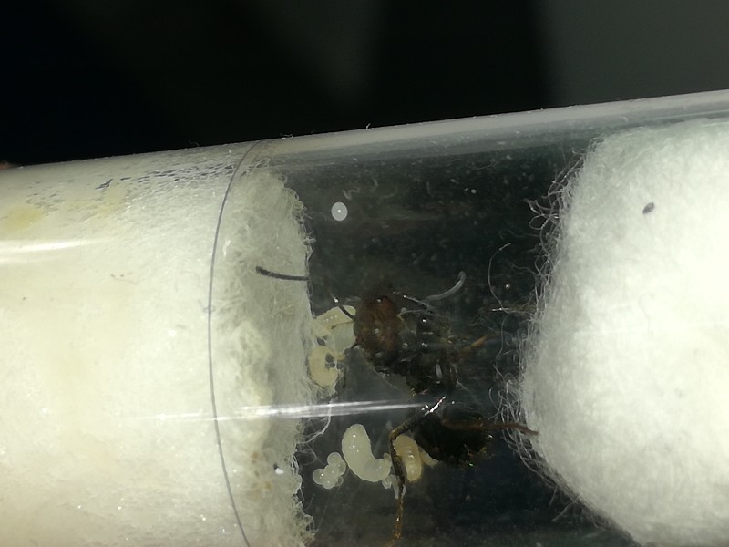 Eccola qua, foto appena fatta ed ho scoperto che ha deposto 3 uova, lunghezza 15 mm neosciamata il 25/04/2017, ti allego i dati precisi in busta. Per lo scambio preferirei una regina di Messor barbarus che ha già iniziato a deporre, se sono presenti larve è meglio. Fammi sapere, grazie.
