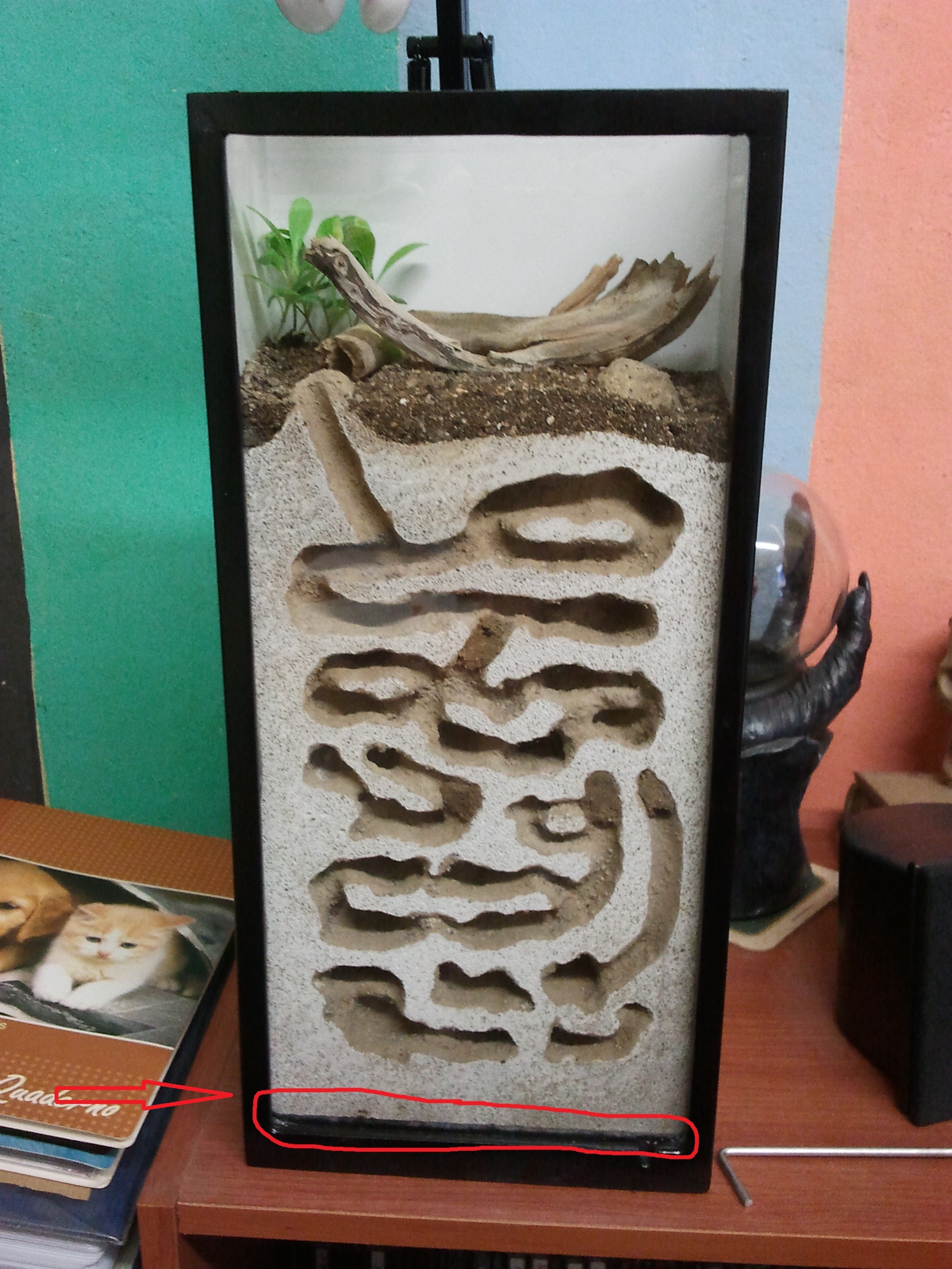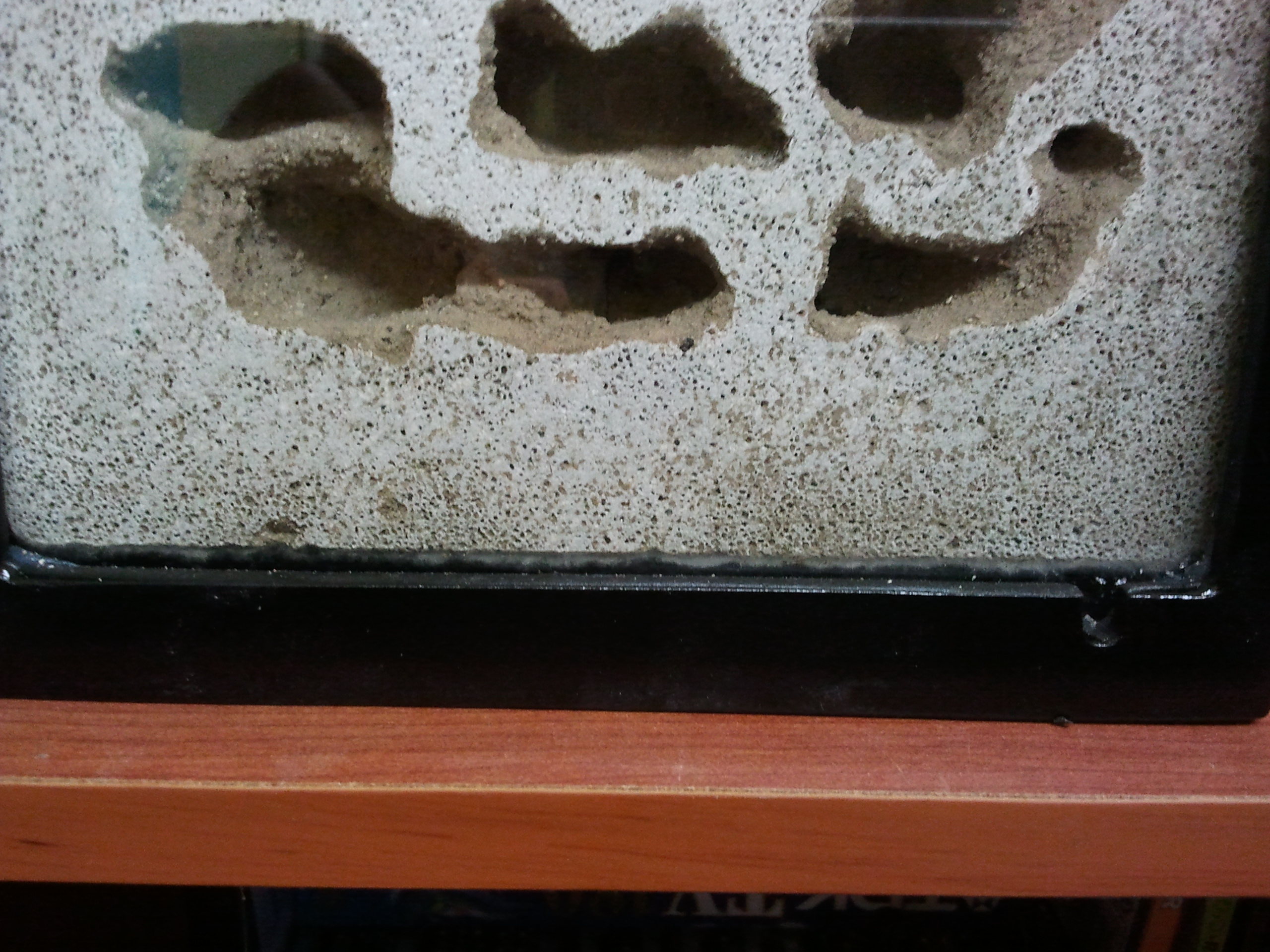 E' proprio un problema di aerazione. E temo che così incassato ermeticamente anche il resto del blocco possa fare più facilmente muffa. Ergo: il sistema non mi piace tantissimo. Potresti riestrarre il blocco e sistemarlo in una teca di vetro più ampia, in modo che solo la faccia anteriore sia a contatto col vetro. Il fondo della teca sarebbe l'arena. Magari con un nuovo ingresso laterale più in basso diventerebbe tutto perfetto. Per la nuova umidificazione potresti scavare degli stretti pozzi sulla faccia superiore del blocco che poi tureresti dopo averli riempiti d'acqua.