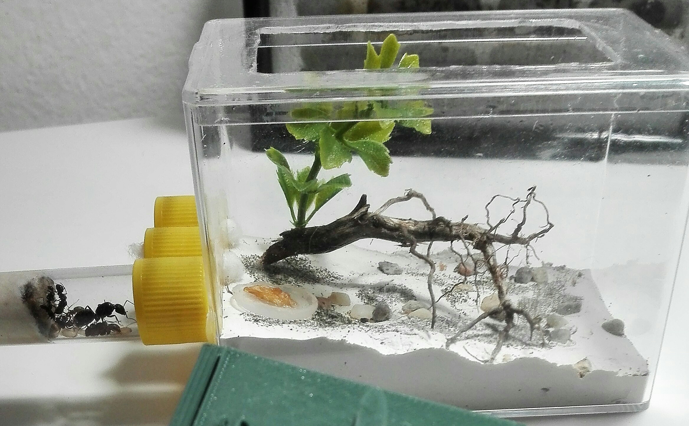Da una parte verrà fissata la provetta con la colonia, personalmente l'aggancio quando compaiono le prime operaie da 5 a 10 e posiziono il nutrimento nell'area di caccia all'imboccatura del nido, questo perché mi è successo che del cibo all'interno della provetta ha causato spesso acari e muffe, le formiche come tutti ben sapete hanno un gastro apposta in cui conservare i nutrimenti, nutrimenti che poi scambiano per trofallassi. Quindi poca strada ok ma fuori dal nido, perché risulterà molto comodo rimuovere la sporcizia facilmente senza disturbare la colonia.
