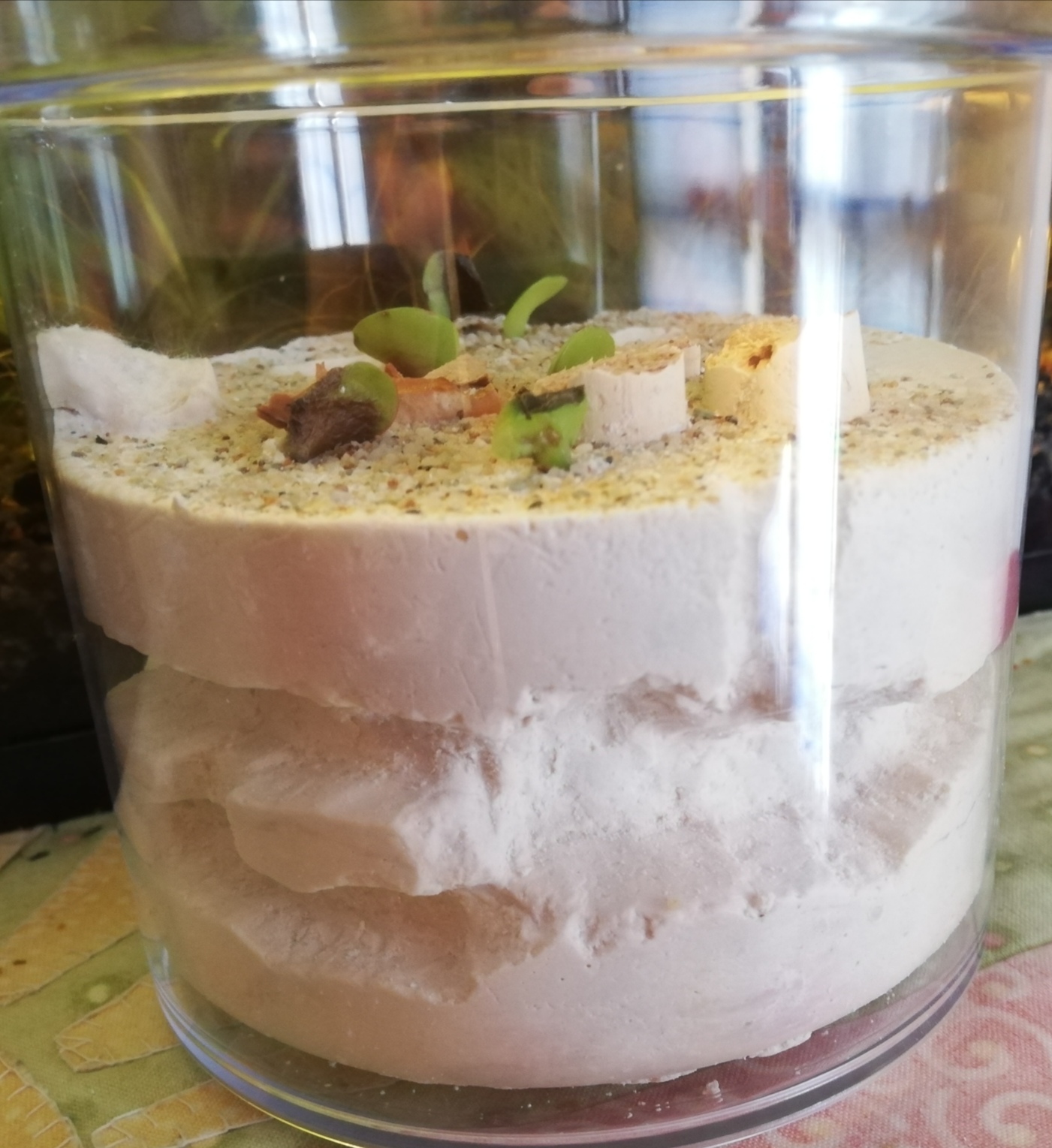 ho scelto io di non poggiare il gesso sul fondo, dovendo metterci una colonia di Tetramorium lo trovo pericoloso fare un nido particolarmente umido. Le Tetramorium sono abili scavatrici e non avrebbero problemi a bucare del gesso umido. Nella descrizione che ho fatto non l'ho specificato ma il gesso che ho usato è gesso ceramico, si vede bene la scritta "gesso ceramico" nella confezione, si nota nella prima foto