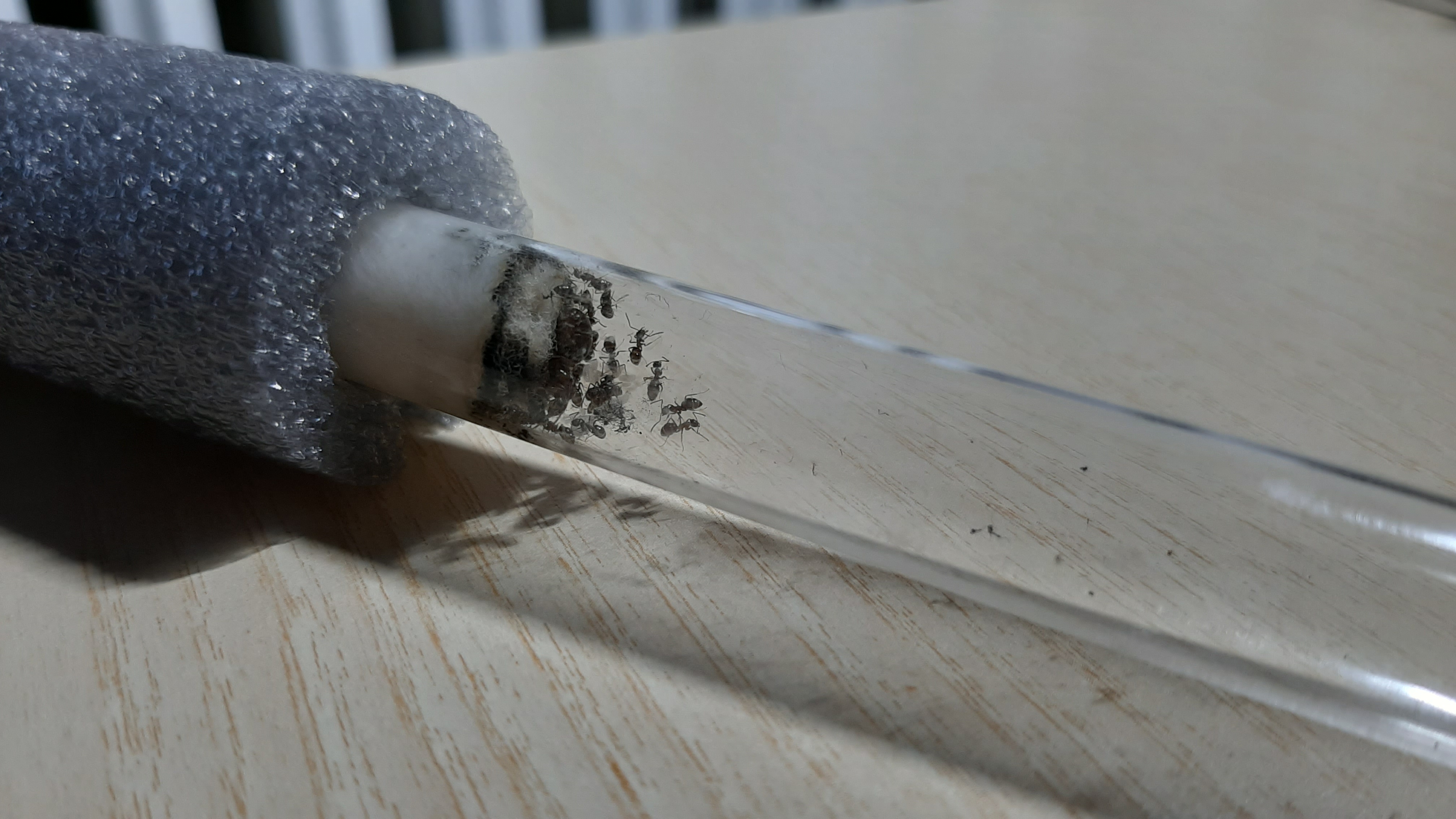 A luglio ho trovato la mia prima regina, quella appunto di Lasius e dopo solo un mese sono nate le prime operaie. Fino ad ottobre, al raggiungimento delle 15 operaie, non mi ha mai dato nessun problema. Poi, quando sono arrivate ad un numero intorno alle 20 operaie, verso fine novembre, mi sono accorto che il cotone della provetta era totalmente nero. No problem, le trasferisco in un'altra nuova, e' normale.