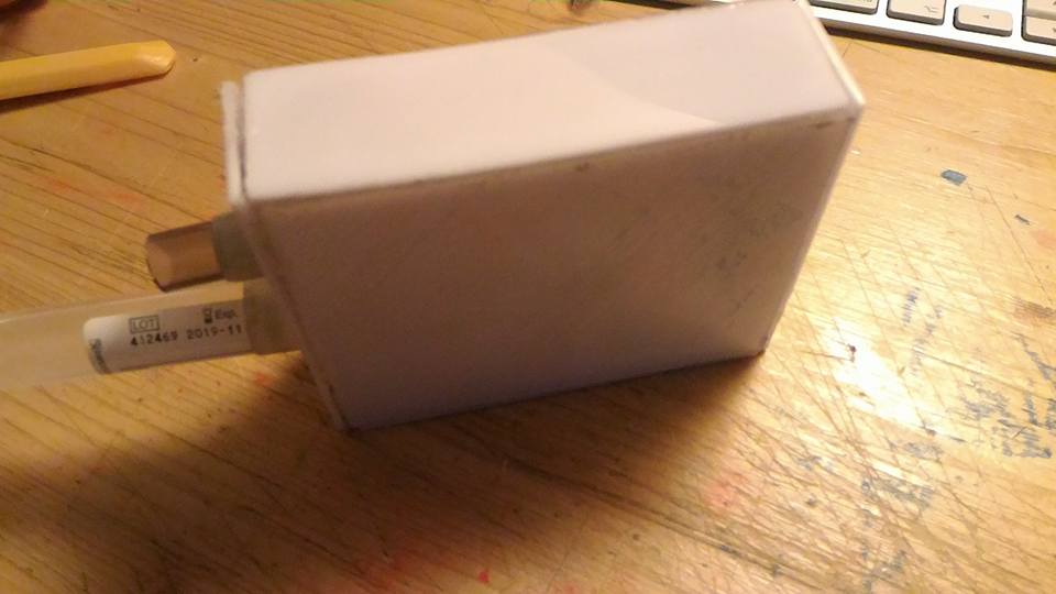 Quest'ultimo l'ho rivestito su tutti i lati con fogli da 2mm di plastica bianca. Attaccati abbondantemente con la pistola termica. Come si può vedere ha un serbatoio, di circa 2 cm cubi, e una piccola zona, profonda circa 1cm, dove dovrebbe stare la regina. Gli ho fatto anche due fori che consentono di inserirci una provetta per cambiare l'acqua e un altro foro per il tubo (diametro interno 8mm), dal quale potrò dargli da mangiare e in futuro far traslocare la (si spera) colonia. Se può aiutarvi a capire le proporzioni, ho posizionato accanto una moneta da 10 centesimi.