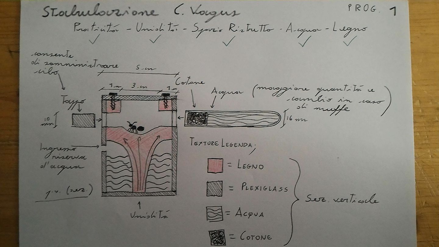 Io diciamo che cerco di capire le circostanze chiave che servono per stabulare un regina (umidità-spazio ristretto-acqua-praticità) e cerco di riportare le stesse usando un materiale più naturale e adatto alle esigenze della specie. Nel caso delle vagus, il legno. Yuri mi ha specificato, cosa che non sapevo, che la regina di questa sp. quando è ancora sola ha bisogno di umidità. Per quel che riguarda, invece, la possibilità di trasferimento della regina nella provetta annessa, la escludo perchè la provetta che si aggancia la tappo fino in cima essendo che non gli deve far da "alloggio" ma deve consentirmi solo di cambiargliela più facilmente e a lei per avere una maggiore riserva. Dunque ora ne progetto uno con una riserva d'acqua per l'umidità. Come già detto, son propenso a utilizzare la provetta per ora ma aspettate di vedere che prototipo tiro fuori...