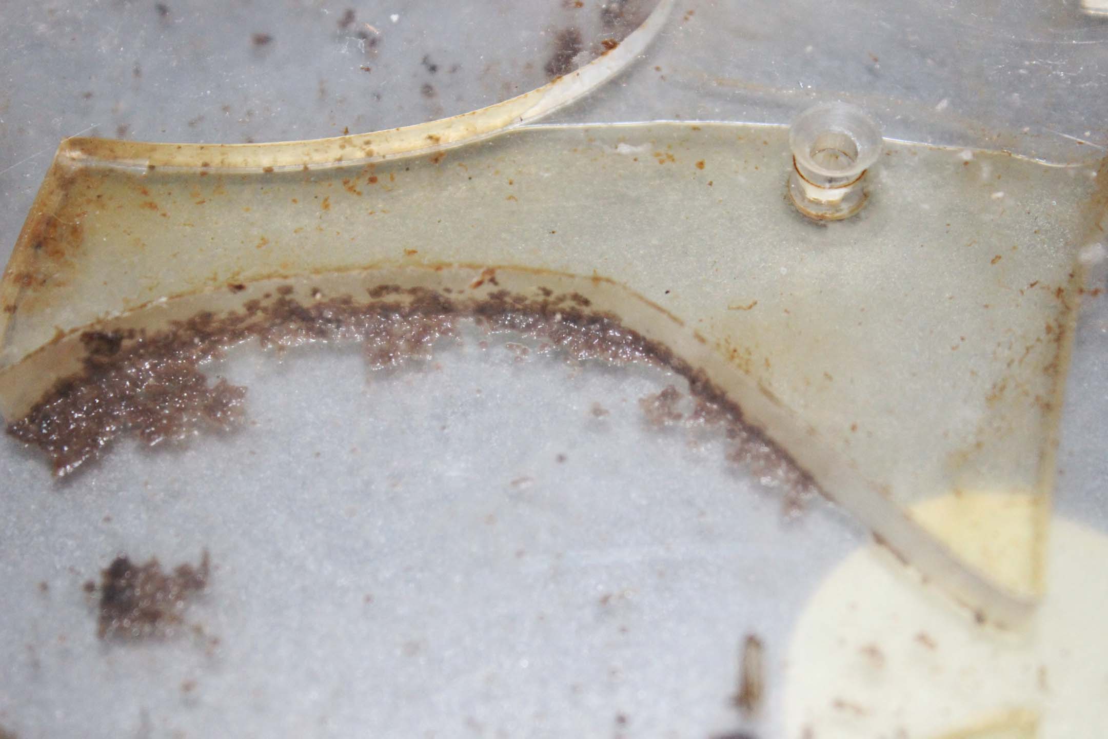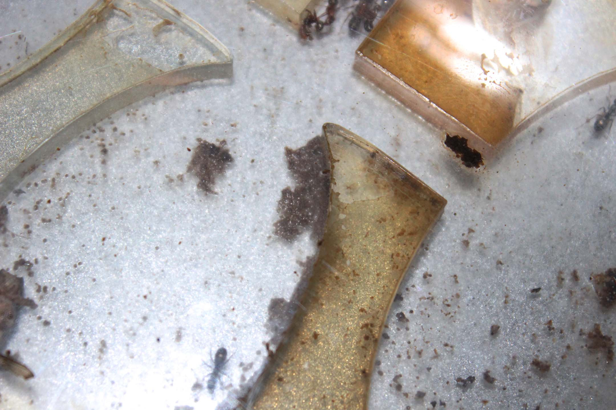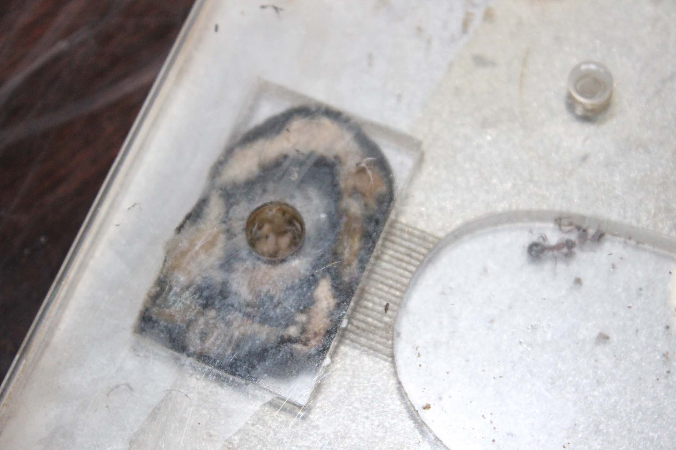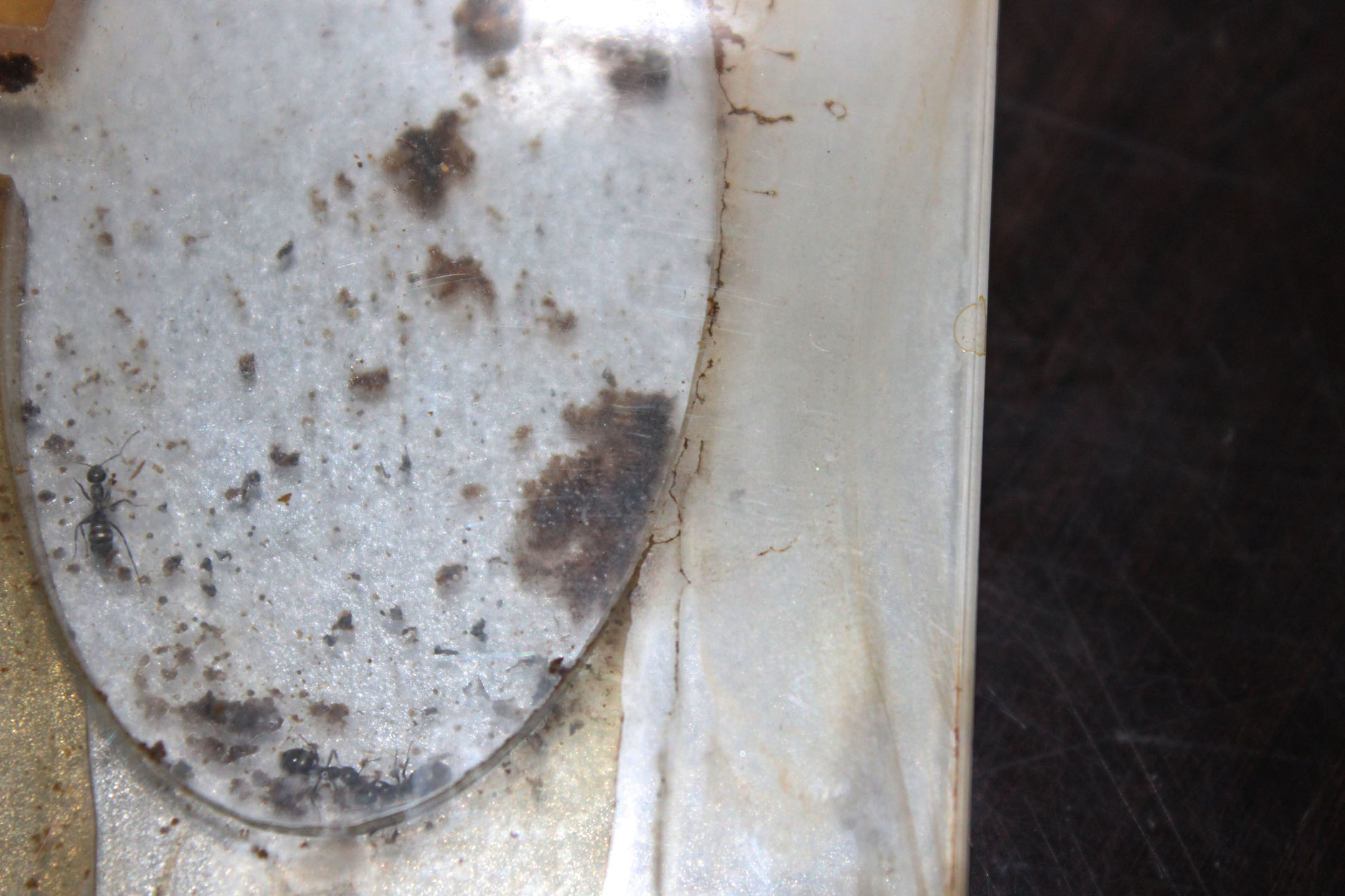 La plastica non è immune a funghi e muffe, poichè le formiche comunque la sporcano. Ecco qualche foto di un formicaio che era lucido in autunno...e guardate ora come si presenta (considerate che durante l'inverno si dovrebbe anche sporcare meno, visto che la colonia ha mangiato quasi nulla).