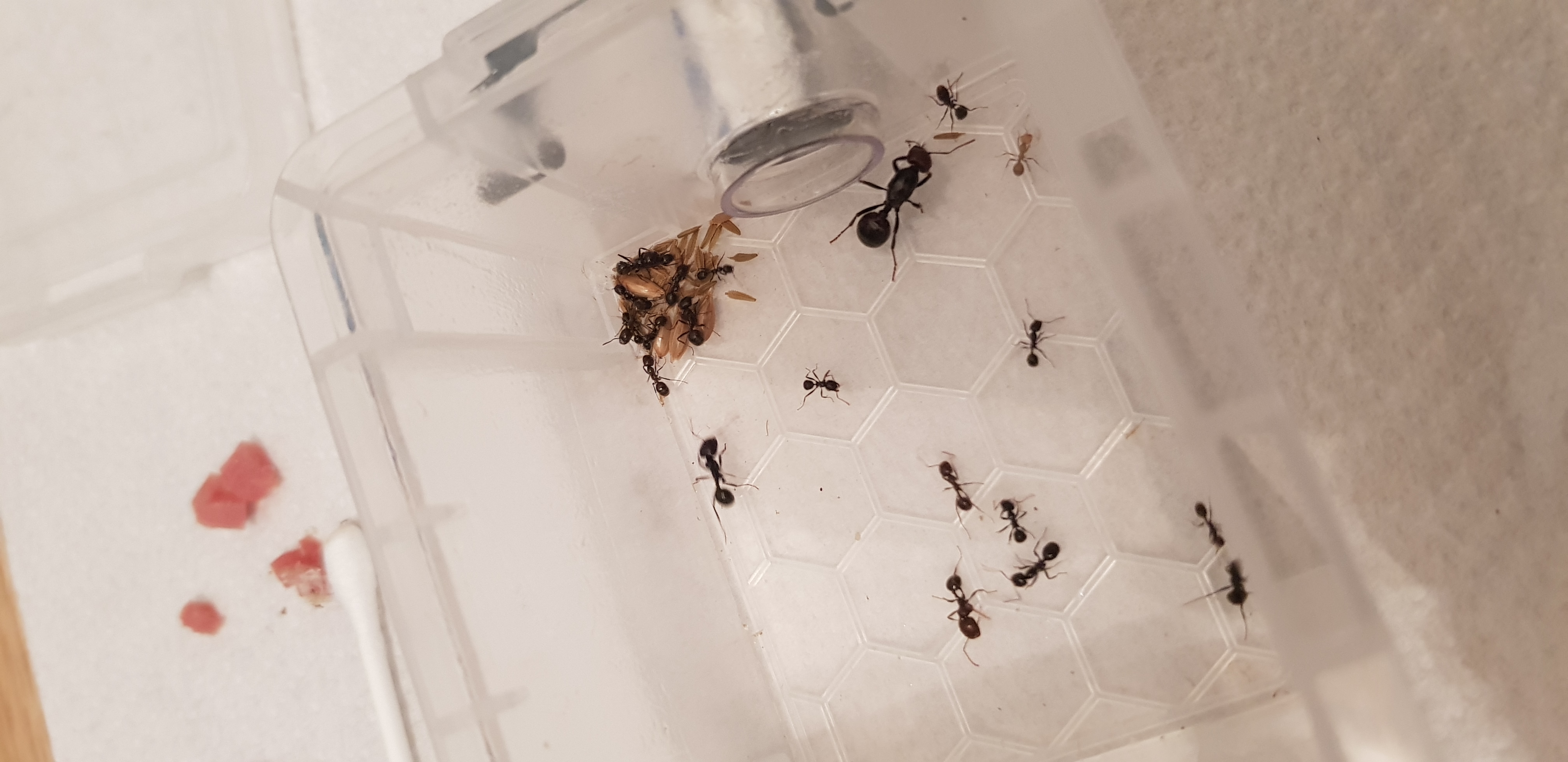 La mia colonia di Messor Barbarus inizia a contare 30 o più operaie con gia qualche major presente. Per ora la tengo ancora in provetta più una piccola arena solo che da qualche giorno iniziano a scavare il cotone che le separa dall'acqua e lo mettono ai lati dell'arena in piu nell'arena stessa ci sono sempre almeno una decina di operaie. Qualche volta non mi spiego perché esce pure la regina a farsi un giro. È forse segno che stanno strette e gli serve un formicaio vero e proprio o un arena più grande?