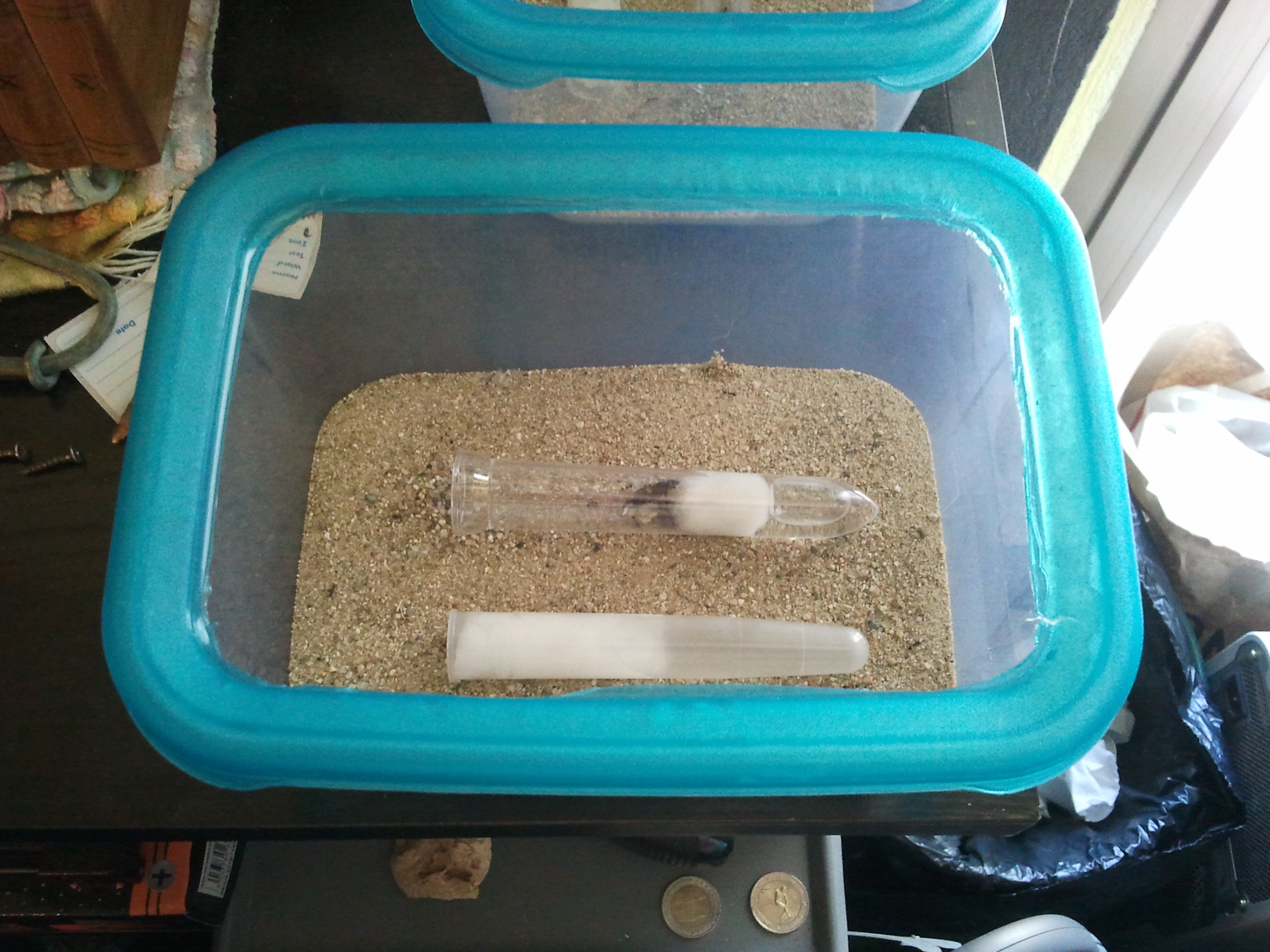 Salve a tutti, vi chiedo urgentemente pareri e consigli. Circa due settimane fa, dopo aver visto che le 2 regine di Messor Capitatus avevano più di 5 operaie, le ho trasferite con la provetta in un contenitore con una provetta supplementare piena d' acqua. ieri e oggi ho notato che in entrambe le colonie è morta un' operaia!