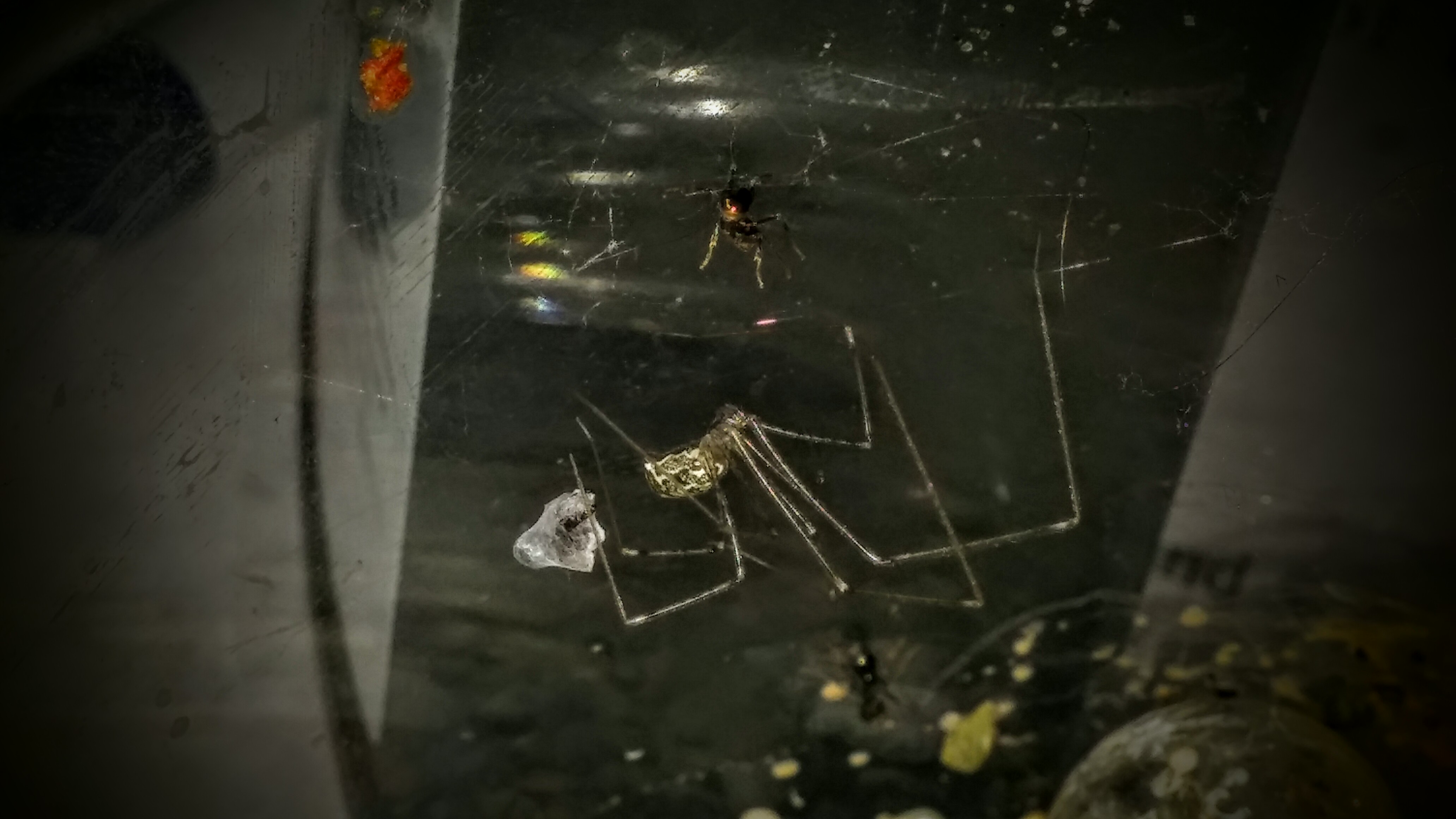 I suddetti ragni visitano costantemente la mensola dove tengo le colonie e si installano temporaneamente nelle arene, li ho visti predare attivamente C. lateralis e C. truncatus, mentre l'arena delle L. emarginatus viene regolarmente e saggiamente snobbata!