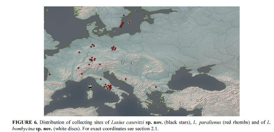 Separati 3 taxa all'interno di "paralienus": L. paralienus con ampia distribuzione in Europa occidentale, L. casevitzi sp. n. come endemismo corso e L. bombycina sp. n. (a mio avviso un errore linguistico dato che bombycinus,-a,-um è un aggettivo di prima classe con significato "sericeo" e andava accordato al maschile; nome già usato per Cataglyphis bombycina in cui figura l'uscita in -a in virtù del fatto che Cataglyphis è insospettatamente femminile, cosa che potrebbe aver tratto in inganno gli autori) con distribuzione in Europa orientale, Balcani e Asia minore.