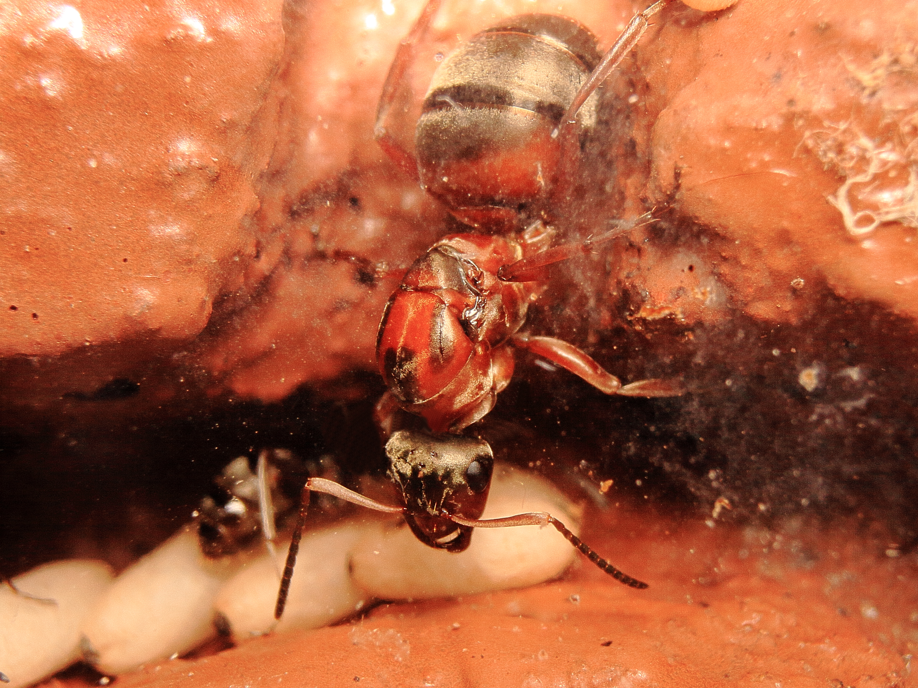 Ci sono vari altri casi di maschi molto grandi in rapporto alle relative regine, anche nella mirmecofauna italiana. Mi vengono in mente alcuni Lasius parassiti come il fuliginosus e il carniolicus. Nel carniolicus i maschi sono anche più grandi delle regine perché queste sono insolitamente piccole rispetto alle altre caste. Poi mi vengono in mente anche i maschi pupoidi del Tetramorium atratulum, che sono anche loro dei bestioni rispetto alle regine. A proposito ho visto da poco una foto scattata da un mirmecologo spagnolo di una copula di T. atratulum e la ho trovata fantastica, dopo se la ritrovo la posto anche qui.