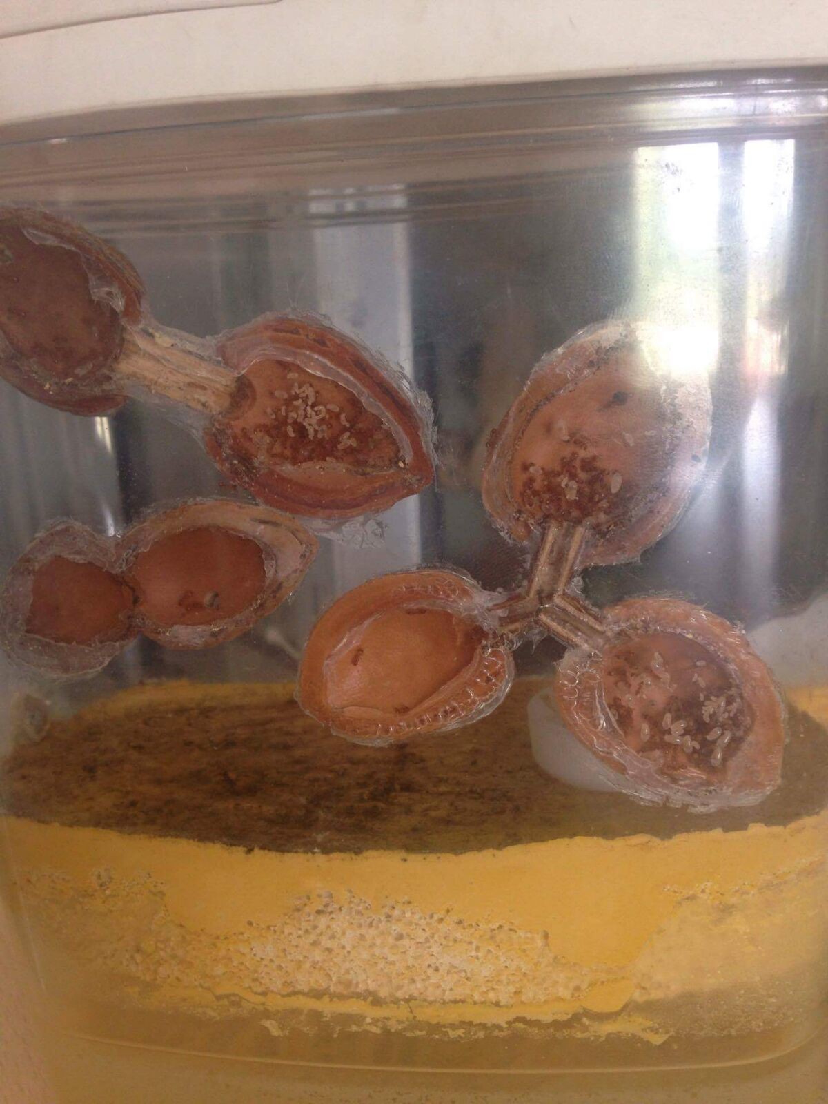 la muffa sulla base non è di nessun problema per le formiche che vivono nelle mezze mandorle, ma si può rimuovere con un minimo di frizione meccanica con un po di cotone bagnato o altro