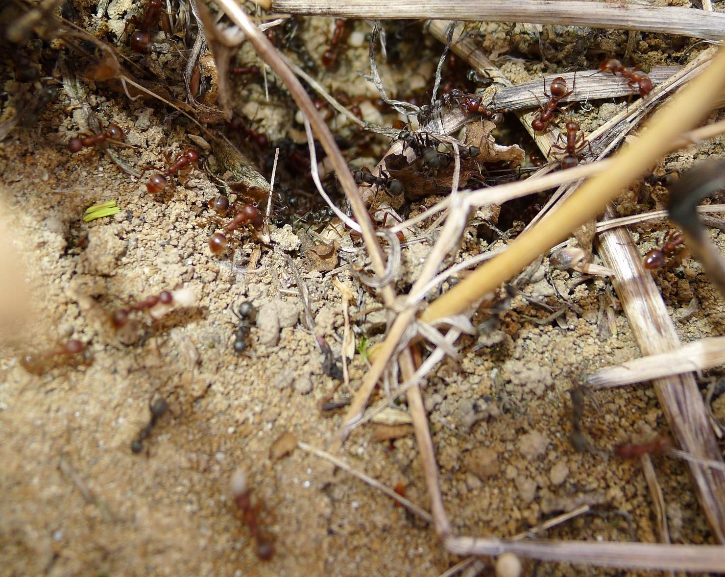 Osservando i dintorni del formicaio saccheggiato, mi sono accorto che alcune "rosse" che portavano pupe arrivavano da un buco ancora più lontano di quello dove in precedenza avevo osservato la maggiore concentrazione dell'attività di saccheggio, portando la distanza complessiva del raggio d'azione delle rapitrici a circa 36 metri.