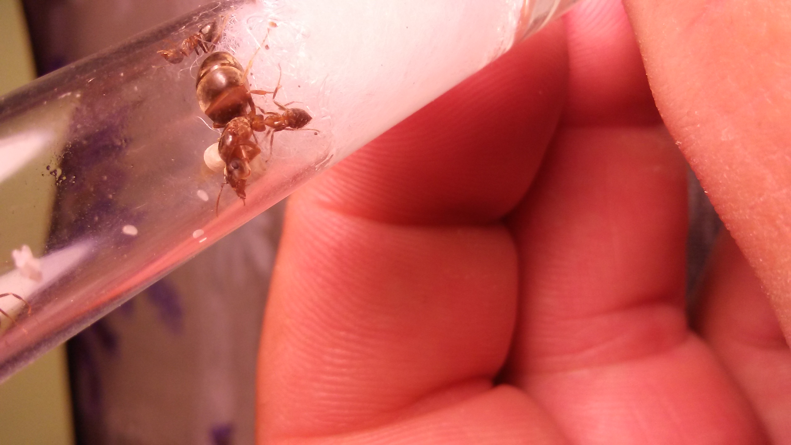 Ho trovato una regina di formica sanguinea, l'ho messa in provetta con pupe di formica di specie diversa, per creare delle ausiliarie, e insieme le ho dato anche 4 servitrici adulte di sanguinea che ho raccolto su un sentiero di feromone a pochi metri da dove trovai sua maestà.