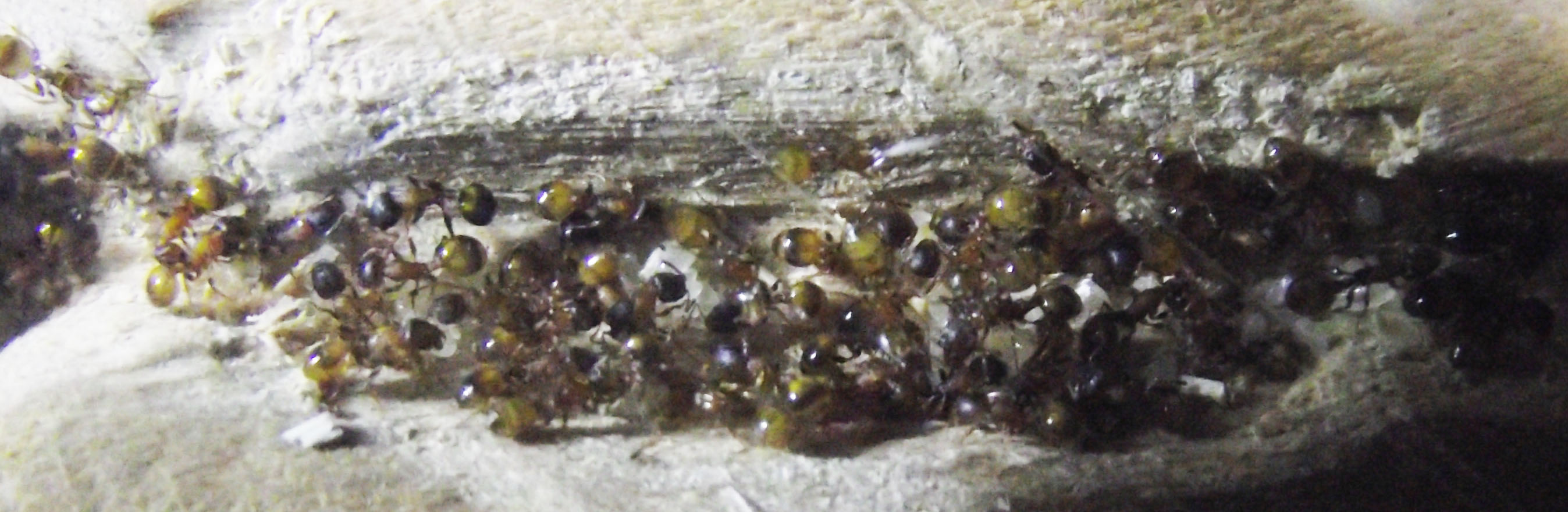 Venerdi mentre lavoravo (lavoro vicino ad una falegnameria) arriva un mio collega che conosce la mia passione con un legnetto che doveva essere utilizzato per alimentare una piccola caldaia a legna. Mi fa notare subito che il legno ha dei buchetti in vari punti allora incuriosito proviamo ad aprirlo. Conteneva una colonia di Temnothorax sp. , regina con 150 operaie circa e tante larve e uova.