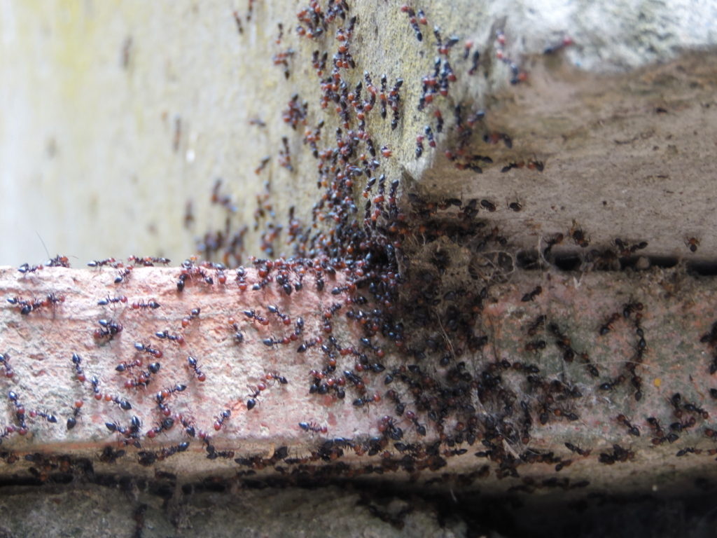 Secondo me, se ci fosse una guerra in atto la noteresti.....semplicemente forse ha piovuto troppo...loro non amano l'umidita, le loro colonie in natura sono immense con tante depandace e solarium.....il vaso si è allagato, il muro si è inumidito e loro si stanno senciplemente riorganizzando
