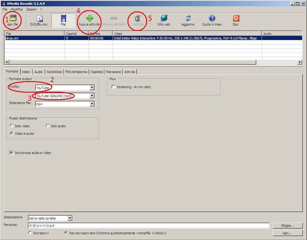 . - Nella scheda "Formato" si sceglie il profilo "YouTube"
