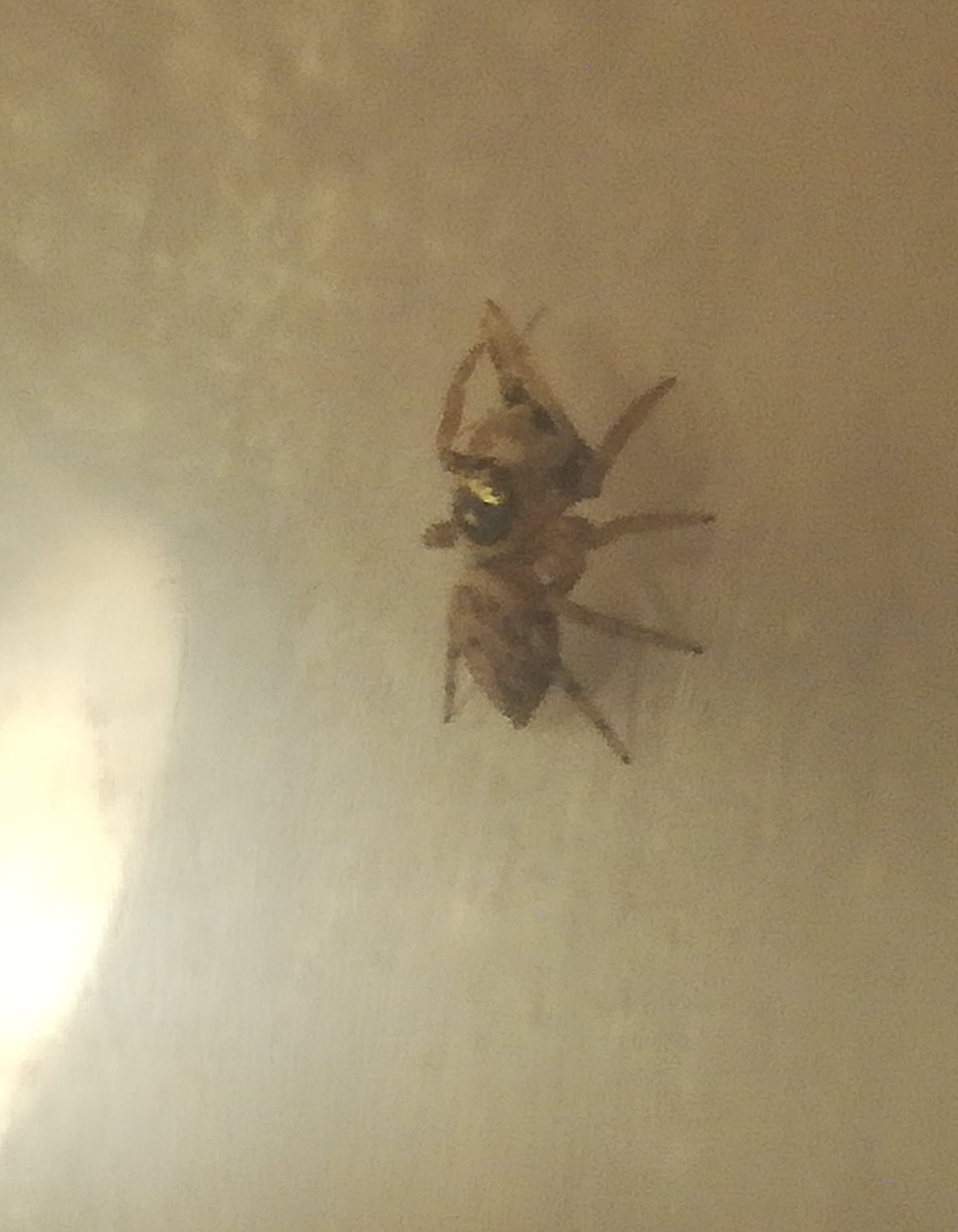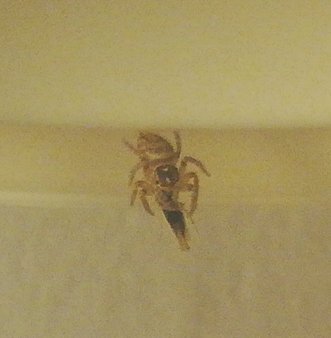 Salve a tutti, comincio l'avventura con i miei primi (e unici che mi piacciono) aracnidi, i Salticidae. Il primo risale a ieri, 6mm spaccati, colore sul giallo sporco e prototorace (penso si chiami così non sono esperto) nero per metà (parte inziale quasi testa); sull'addome marrone chiaro alcune macchie bianche.
