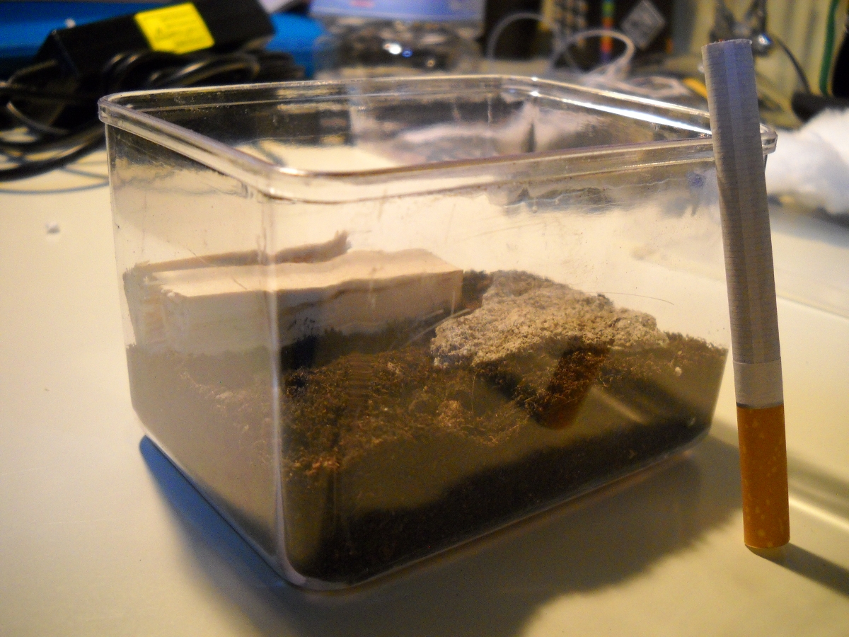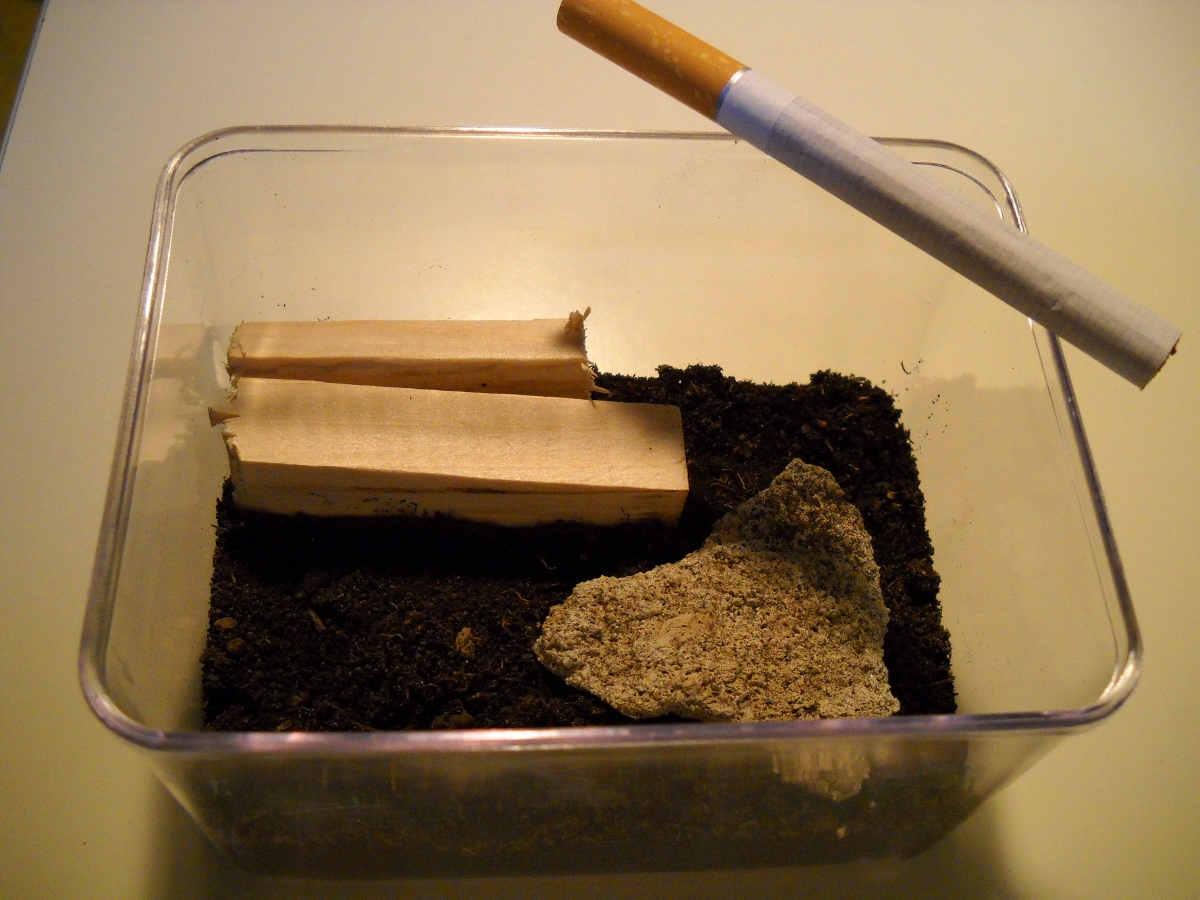 A quel punto ho allestito un piccolo terrario, utilizzando una scatoletta di (10x7)cm, nella quale ho sistemato 3cm di torba e terriccio, una pietra piatta e due pezzetti di legno. Tutti gli elementi sono stati precedentemente passati al microonde.