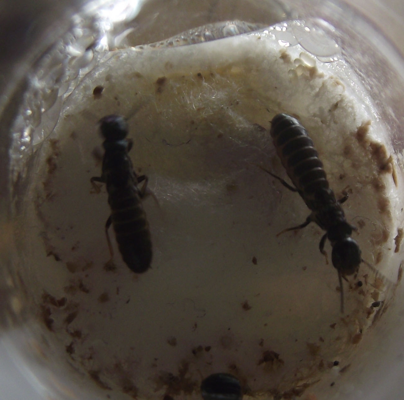 Messi in una provetta in verticale al bordo del mio acquario con fissi 25/27 gradi. Terra e legno e tappo di sughero sopra. Le ho praticamente dimenticate li, quando dopo mesi le ho tirate fuori nel lato nascosto ho visto una piccola camera con forse 5 operaie 1 soldatino e i due reali. Dopo di che, le ho lasciate a loro stesse. (avevo le Kalotermes che mi davano un sacco di soddisfazioni. Le ho lasciate ancora lì per un bel po', fino a quando, non ho notato un corridoio coperto appoggiato al silicone dell'acquario che portava a un pezzo di legno (quelli decorativi per gli acquari) lasciato nella zona lampade. Avevano mangiato tutto il sughero e cercavano altro.