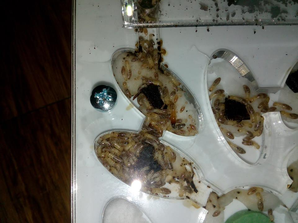 Un paio di foto: sono visibili il riproduttore primario e svariati individui appena mutati, riconoscibili dal colore latteo.