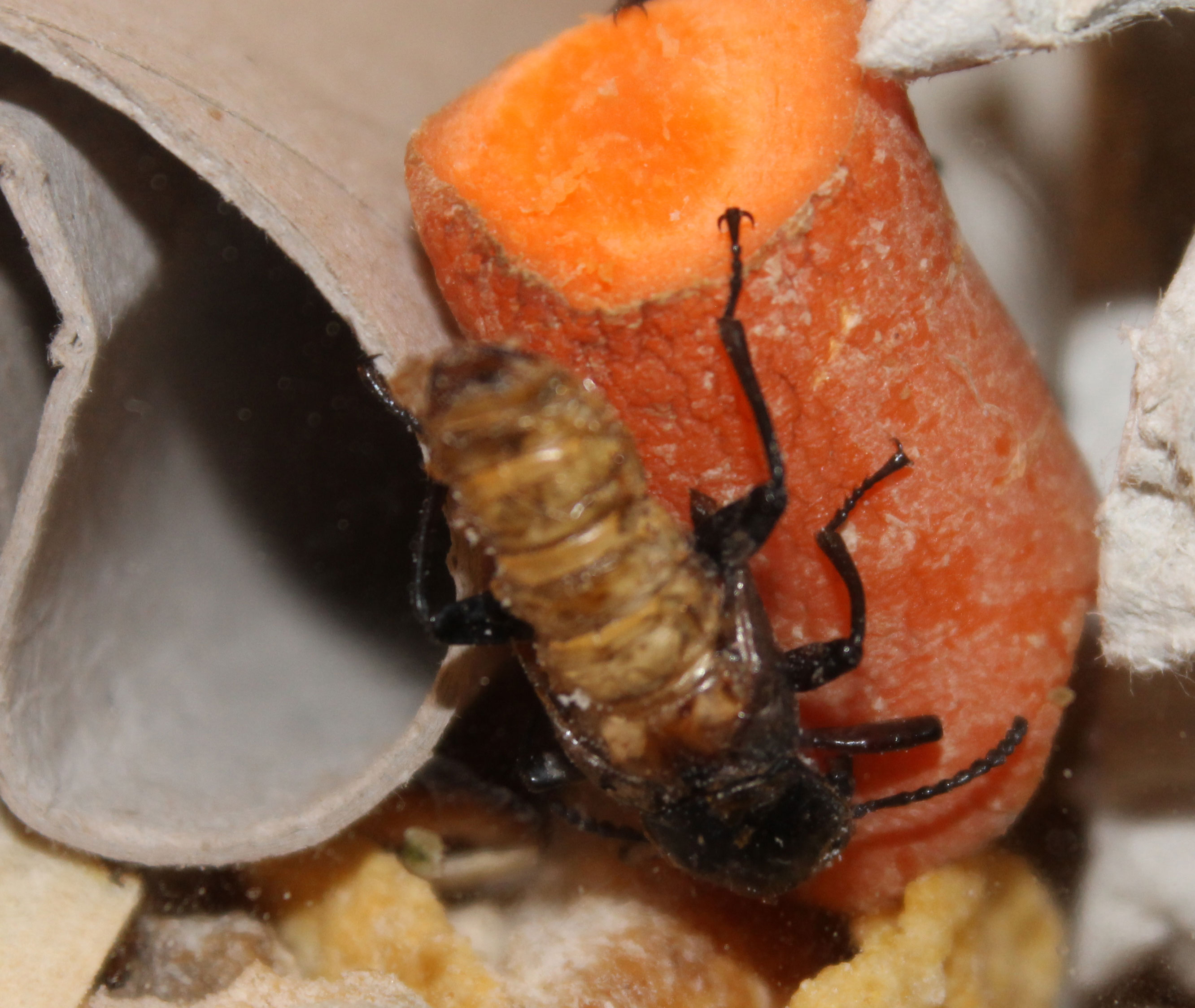 Ci ho provato, ma non viene via, a differenza delle altre mute che sembrano carta praticamente, questa è tipo gommosa ed elastica e non viene via, tra l'altro col passare dei giorni le elitre sono rimaste in posizione "pupale" (cioè abbassate tra il secondo e il terzo paio di zampe) e ormai si sono indurite in questo modo, quindi anche se riuscissi a sfilare il resto dell'involucro pupale il ventre sarebbe del tutto scoperto, mi è parso strano perchè era alle stesse condizioni di temperatura e umidità (praticamente quasi assente) degli altri nell'incubatrice.