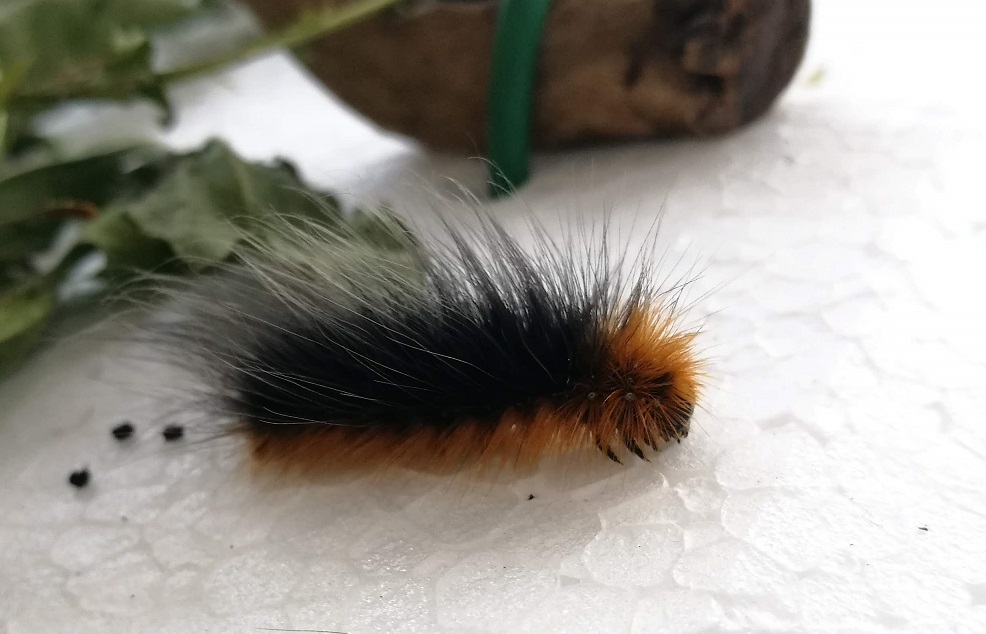 Trattasi di arctia caja, in inglese il bruco si chiama wolly bear caterpillar e la falena garden tiger moth