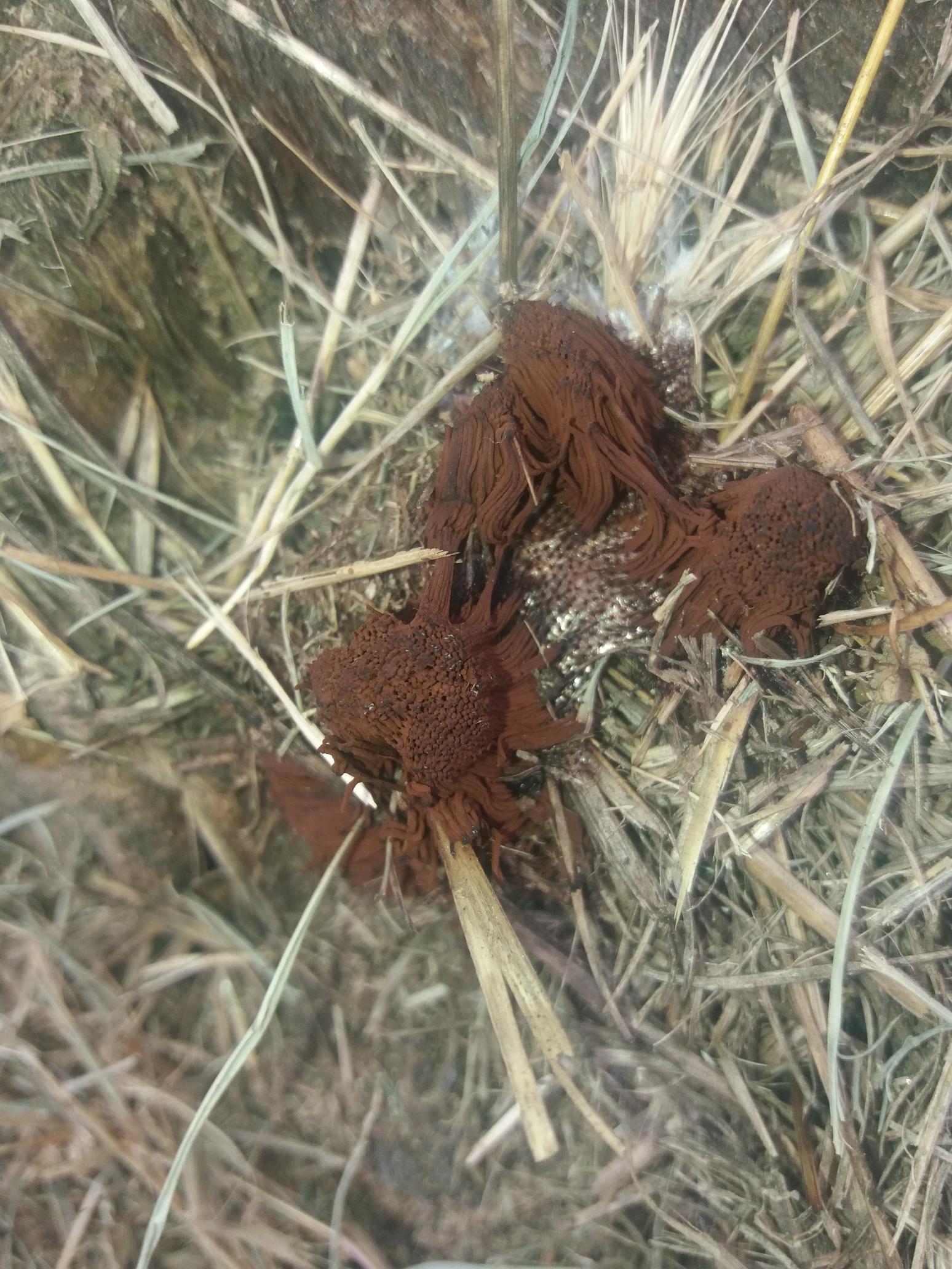 Aggiornamento: i filamenti di ieri sono diventati veri e propri tentacoli rivolti all'esterno! Sono flaccidi e, se toccati, rilasciano una specie di polverina marrone. Aiuto! Sembra un essere alieno!