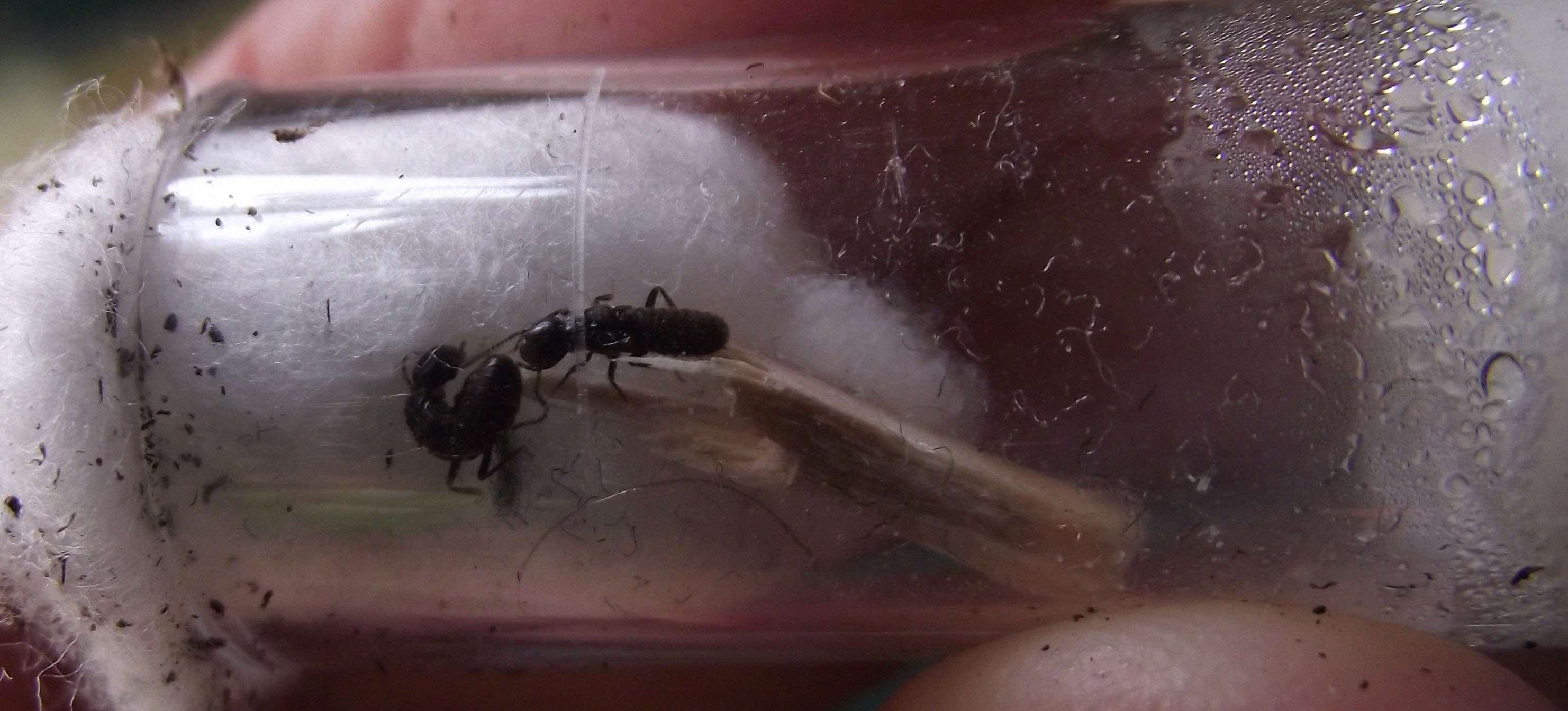 In provetta sono tutti molto nervosi, mentre nel terrario vedo dei comportamenti diversi... Alcuni cercano di decollare, mentre altri si "inseguono": uno segue un altro con le antenne attaccate al gastro di quello che lo precede.
