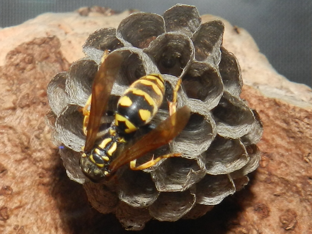 per prima cosa mi piacerebbe un identificazione della vespa in questione, nel nido era da sola, ed oggi fra pioggia e temperature non vola nulla, e nel nido, palesemente dell'anno passato, sono presenti quasi una decina di cellette occupate fra uova e larve.