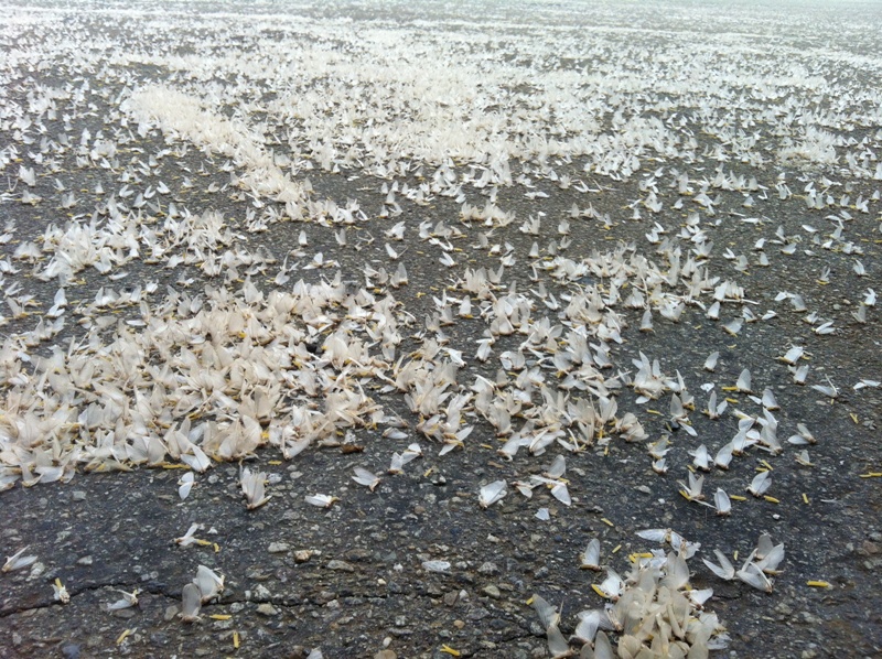 Vi assicuro che non è un esagerazione, ogni anno ci ritroviamo' ,da un giorno all' altro, una distesa bianca simile a una nevicata....in corrispondenza dei lampioni lo strato di insetti raggiunge i 3/4 centimetri