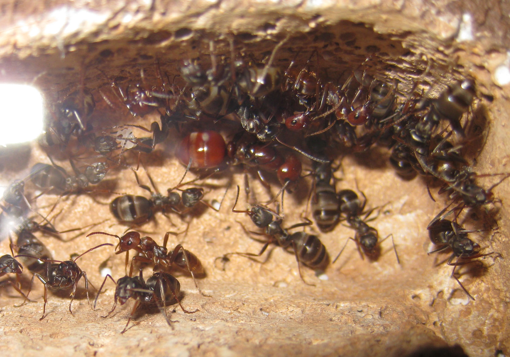 E' bastato, su esperienza precedente di Luca, capovolgere delicatamente il vecchio nido (in gesso di tipo 2) in arena, e far mancare alle formiche la protezione del vetro.