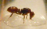 Ieri pomeriggio ho trovato in giro in Oasi questa formica. E' una regina (guardando con lo stereomicrosccopio si vedono bene le cicatrici delle ali) ma a giudicare dalle dimensioni dell'addome e dalla forma a sciabola dell'apparato boccale avevo pensato ad una schiavista...comunque non mi sembra sia in grado di fondare da sola una colonia. Ha il torace lievemente più scuro (marrone scuro) mentre testa e addome sono più chiari. Lunghezza sugli 8 mm.