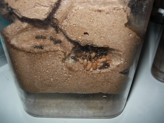 Al momento ci saranno almeno 20 uova. Sono seguite sempre e soltanto da una operaia (non so dire se sia la stessa o cambi). Tuutte le altre operaie passano l'intera giornata "prostrate" intorno alla regina...quasi comppletamente ipnotizzate. Solo ogni tanto, messo un insetto vivo nel formicaio visto che non escono mai in arena, qualcuna si distacca per far fuori l'intruso e portarlo alla colonia...che subito lo divora.