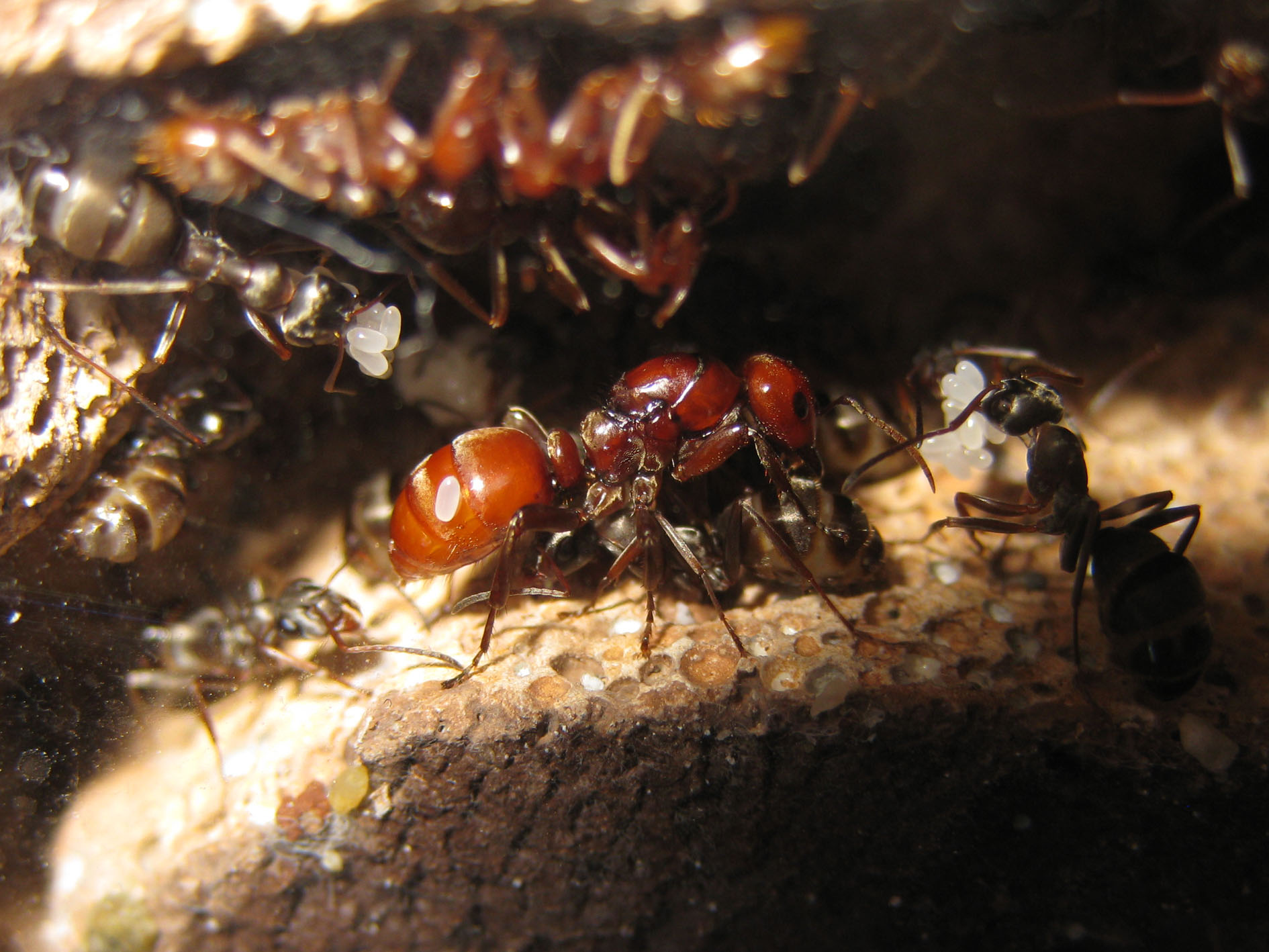 E' bastato, su esperienza precedente di Luca, capovolgere delicatamente il vecchio nido (in gesso di tipo 2) in arena, e far mancare alle formiche la protezione del vetro.