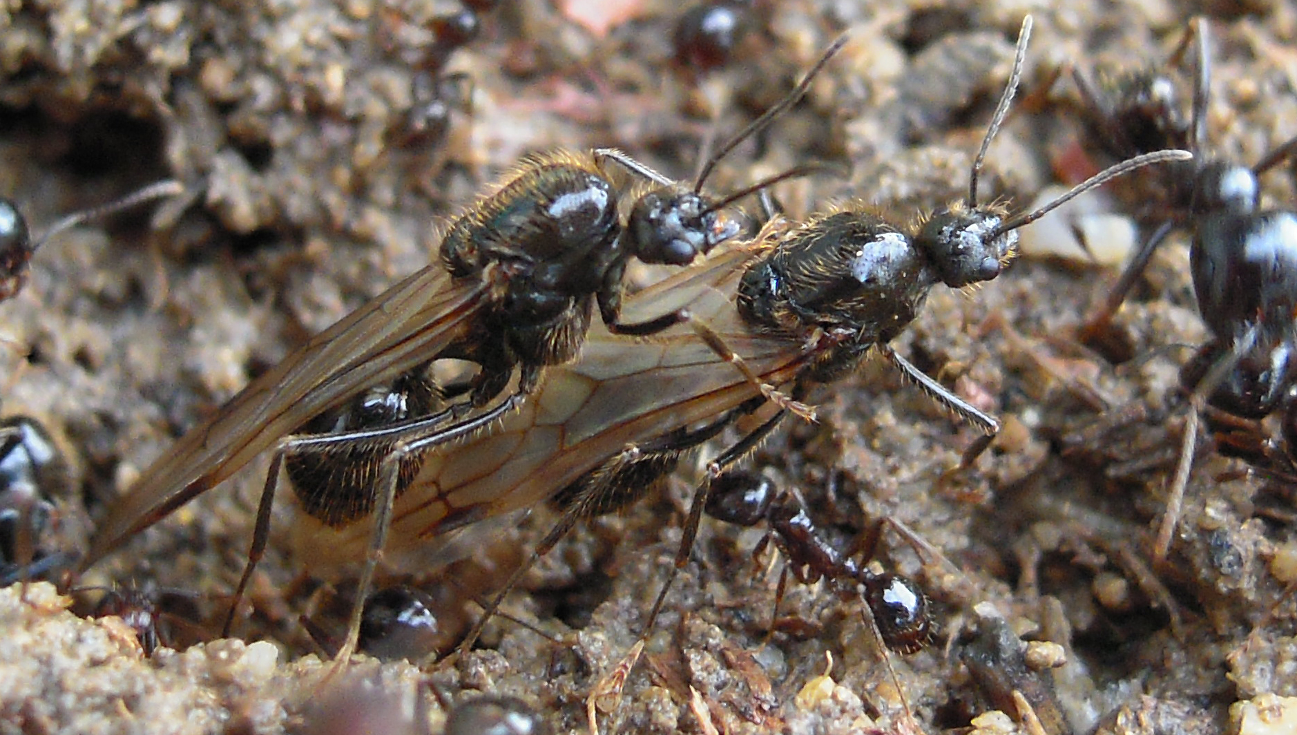 Ho colto un momento di intensa attività: le operaie brulicavano e sono saliti in superficie una decina di maschi e qualche regina. In questa gara per salire il secondo maschio ha pensato bene di sfruttare il primo come possibile rampa di lancio :D