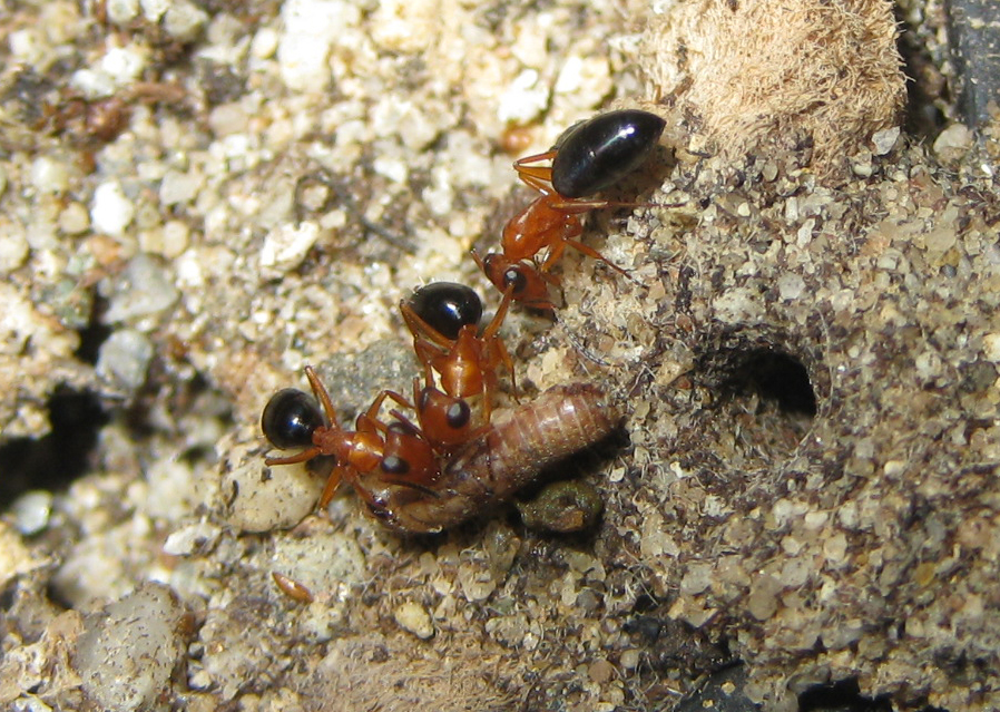 Nell'ordine: Opistopsis rufoniger, Camponotus nigriceps, con la regina ancora in buona salute, e la covata delle Iridomyrmex.