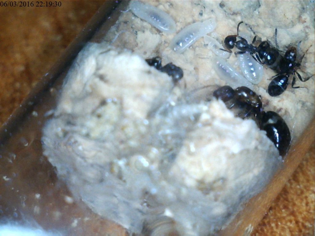 Offro poco miele (circa 1 volta alla settimana),mentre le proteine vengono offerte continuamente (1-2 drosofile al dì): probabilmente, è per questo che la regina sta deponendo continuamente e le larve stanno crescendo molto. Tra le pupe, ho notato anche quella di un'operaia con una testa più quadrata; vedremo se è un soldato o una minor più grossa (credo di più al primo, visto che ci sta mettendo molto per pigmentarsi e perché sembra essere più grande di 3 mm rispetto alle altre pupe).