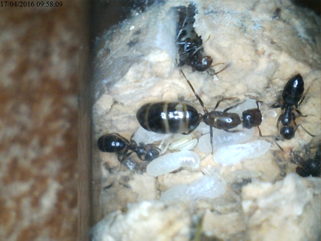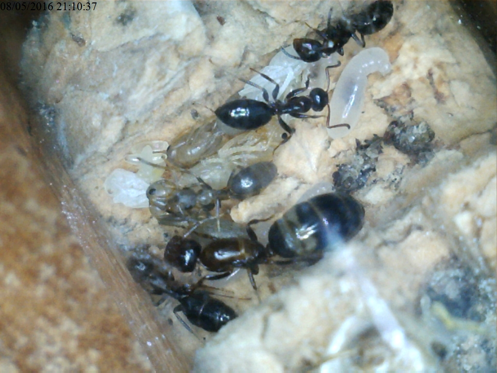 La colonia è arrivata alle 12 operaie. Siccome cercavano sempre di evadere dalla provetta, ho deciso di aprire la colonia in arena. Ho fatto una prova di convivenza fra due specie: nella stessa arena, c'è anche un nido con una colonia di Temnothorax sp.. Per ora, tutto è andato bene: le due specie convivono pacificamente, anche se quando due operaie s'incontrano cambiano strada.