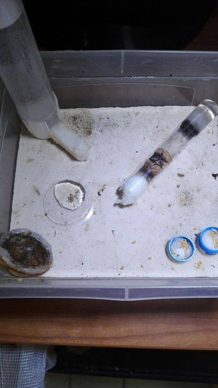 Ad oggi, la colonia ha raggiunto le 6 operaie, tra cui una media (ha un capo più grosso rispetto ad una minor ed è anche più grande), il resto invece sono tutte minor. Ieri ho offerto miele e drosofile, che sono stati ben accettati.