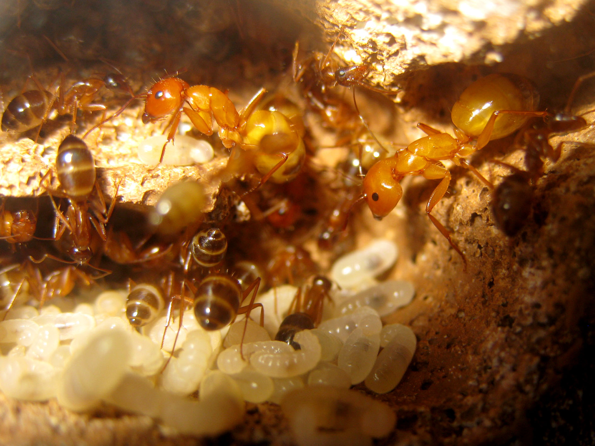 come potete notare la formica cerchiata a sinistra è più grande rispetto a quella destra, presumibilmente nata l'anno scorso, ma quello che salta all'occhio è la colorazione leggermente differente, come ha fatto notare Gianni stanno un po' di più a pigmentarsi però ho notato che alcune formiche non si pigmentano quasi del tutto. Considerate che la formica a sinistra è nata - se la mia memoria non fa cilecca - fine luglio inizio agosto ma è rimasta chiara, questo tipo di pigmentazione l'ho notato anche in una media riconoscibile subito dal colore giallo ocra/arancio e non arancio/bruno classico delle C.nylanderi, come Gianni anche nel mio formicaio le formiche soldato non escono, ogni tanto esce una media ma fa un giro veloce e rientra.
