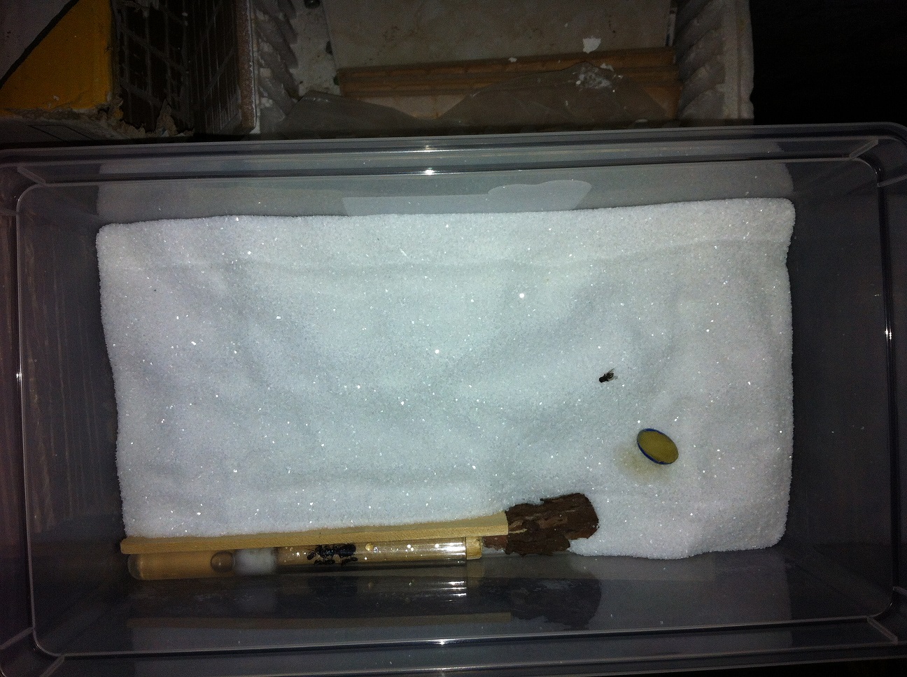 Il fondo mi sembra la sabbia di quarzo bianco di tipo finissimo (tipo sale) che si compra per acquari. Se è così... Leva la provetta da lì dentro!!! Questa sabbiolina è mortale perché contiene polvere finissima che non va via neanche se risciacquata e che uccide le formiche. Si infila in articolazioni e spiracoli e ne causa la morte. Ti assicuro che parlo per esperienza poiché ne ho provati molti di fondi. Questo proprio non va bene ed è questo il motivo per cui le tue operaie si muovono all'esterno in modo da stare sempre sospese su qualcos'altro. Altri tipi di ghiaia per acquari a grana più grande, compresa quella di quarzo bianco, vanno benissimo dopo che ne hai risciacquato la polvere.