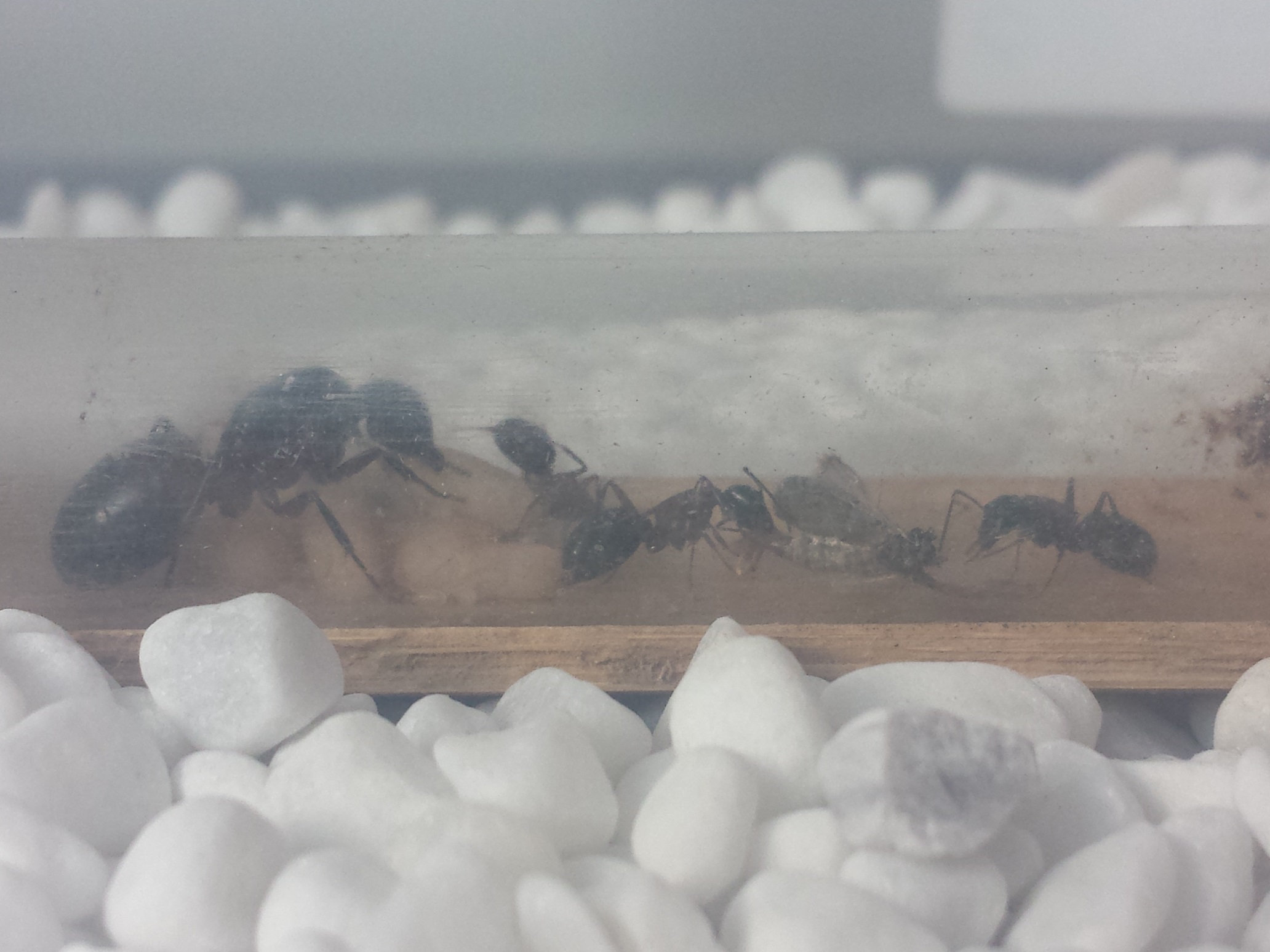,questa è la piccola arena dove solo 2 operaie escono a gironzolare mentre le altre 2 restano accanto alla mamma.quello che ho notato è che quelle 2 che escono mi mettono sempre su quella asticella al fianco della provetta e ci restano a volte per molto come mi stessero chiedendo una casetta in legno invece della provetta in plastica che ho dato loro come nido almeno per ora.ora invece di quella mosca c'è un grillo quasi morto che si muove ancora e che a furia di rotolarsi è arrivato all'entrata della provetta ma loro ci passano davanti senza calcolarlo forse è troppo grande per loro?noto che quando si avvicinano e lo toccano con le antenne gli girano le spalle velocemente ma comunque escono e non hanno paura di frequentare l'arena.cmq la situazione sembra tranquilla la regina non si dimena e si muove raramente,è posta sopra le uova e resta sempre li non si allontana mai insieme alle 2 operaie che restano semprecon lei..se ho sbagliato qualcosa vi prego di consigliarmi ma almeno a me sembra tutto a posto