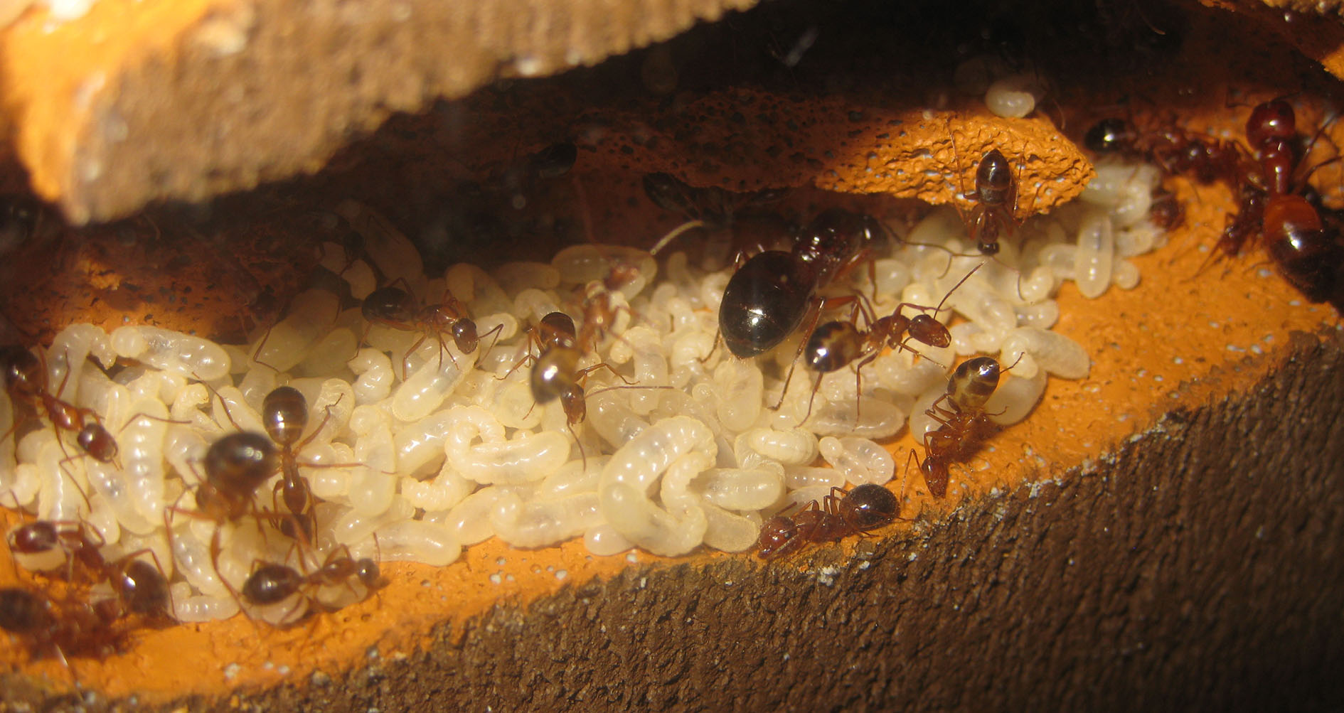 Ora anche io segnalo la presenza di enormi larve nella colonia di C. nylanderi; in precedenza era stato un falso allarme, ed erano nati solo soldati di una stazza superiore, ma ora terrò d'occhio le nascite e vedrò se si verifica la stessa situazione, nel qual caso dovremo ragionarci sopra.