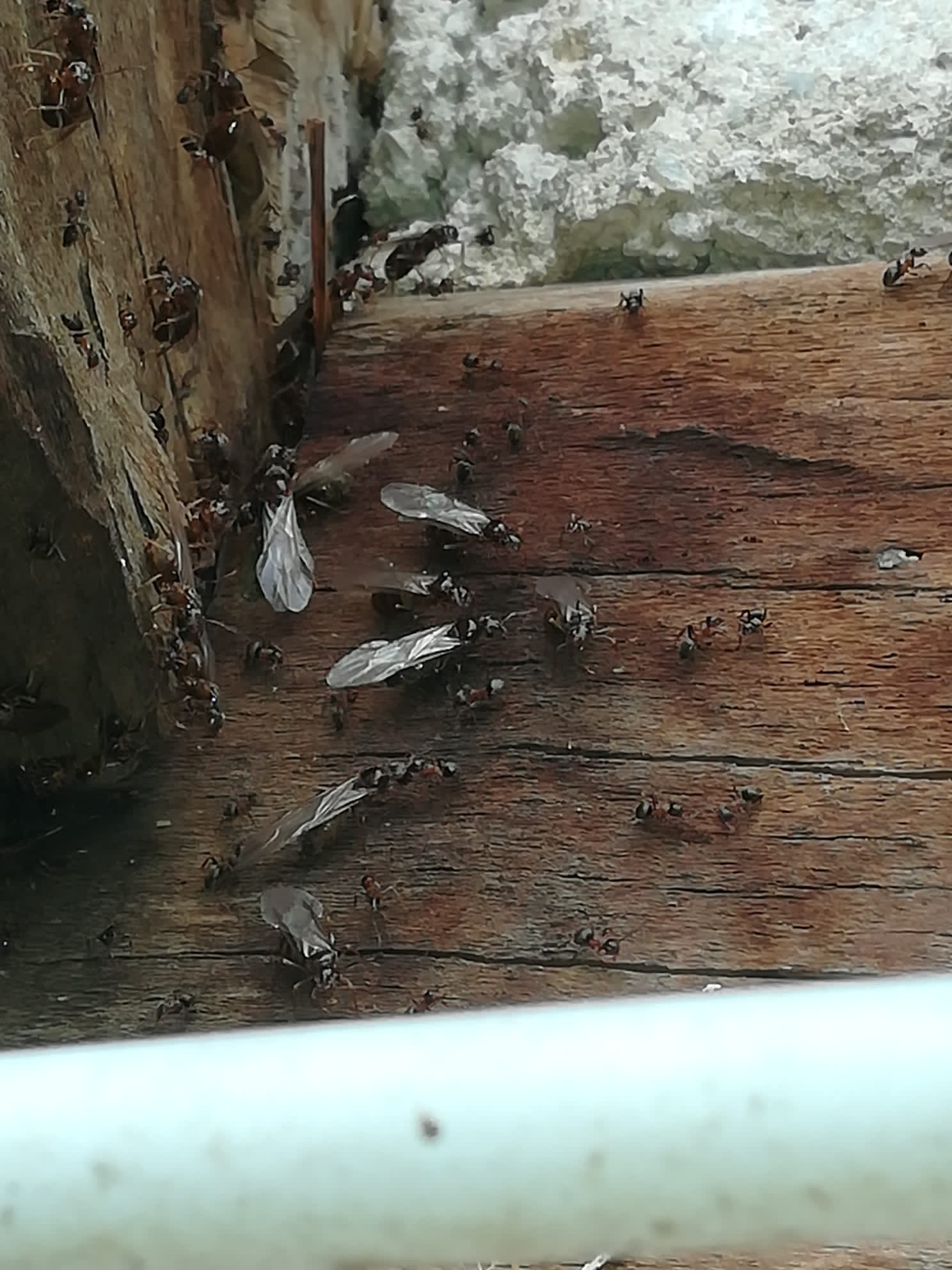 Ciao in questi giorni si sono susseguiti temporali e giornate assolate. Su una trave del fienile ho potuto osservare questo magnifico spettacolo. Purtroppo non ho una fotocamera ma ho utilizzato un smartphone. Dovrebbe trattarsi di Camponotus ligniperda ho visto diverse operaie maggiori a spasso nella zona.