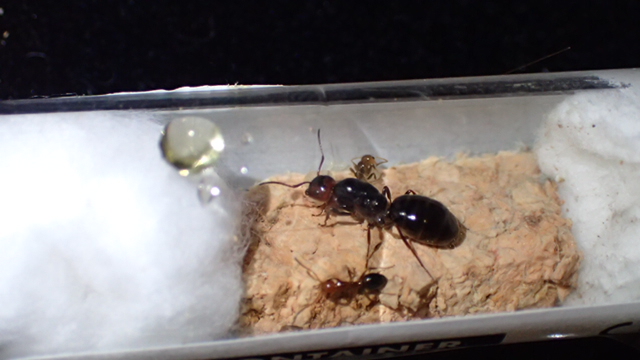 Anche le mie hanno sfarfallato le prime operaie da poco, dai un po' di miele e acqua assorbiti su un piccolissimo pezzo di cotone e vedrai come si dilatano gli addomi delle operaie. Poi puoi dare una zanzara o un moscerino e aspetta che lo finiscano per non lasciare resti nella provetta.