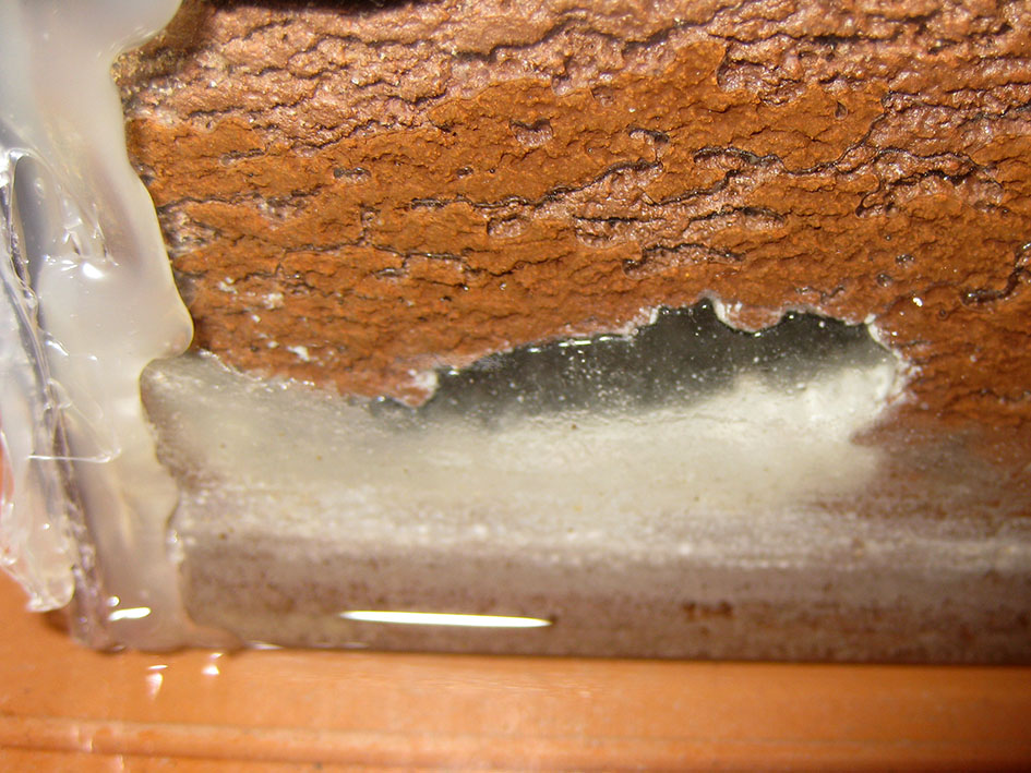 Lasciato asciugare per alcune ore in ambiente asciutto il blocco, metto un colore di contrasto, che permetterà alle gallerie interne d’essere più visibili sul fondo. In questo caso dovrò usare un pennello e della tempera diluita, altrimenti sarei costretto a mascherare tutte le gallerie e ne risulterebbe un lavoro improbo.