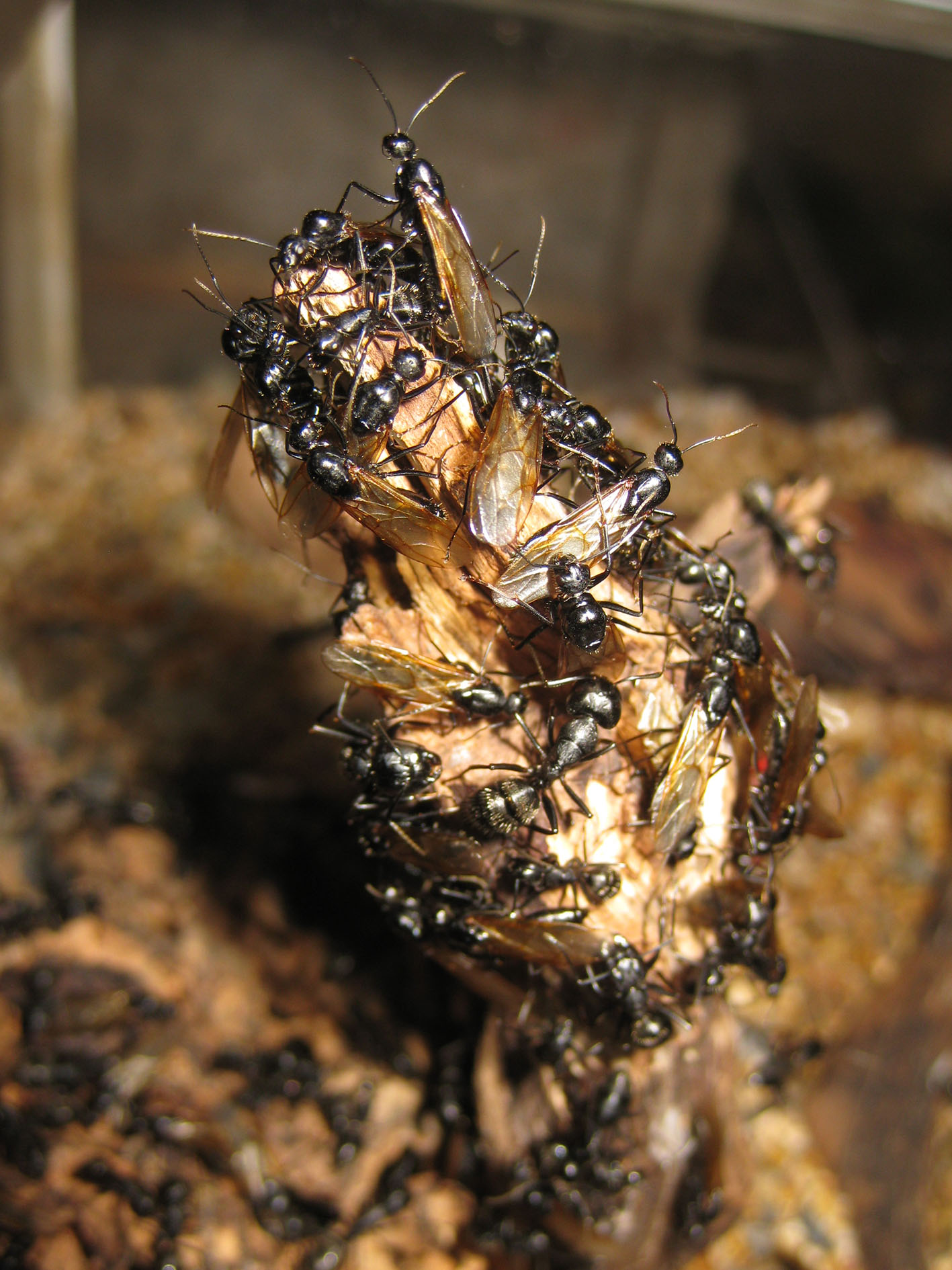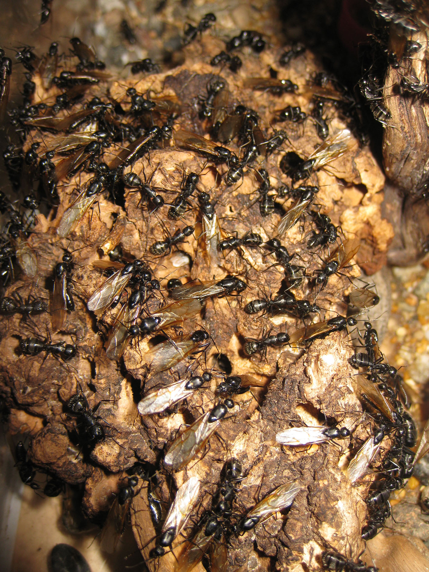 Il nido interno è quasi vuoto. Ci sono circa 200-250 operaie di tutte le taglie che accudiscono una covata abbondante, e sono molto tranquille; invece in arena, tutta l'ultima settimana è stata una bolgia di alati e anche qualche operaia, più tutte le regine dealate.