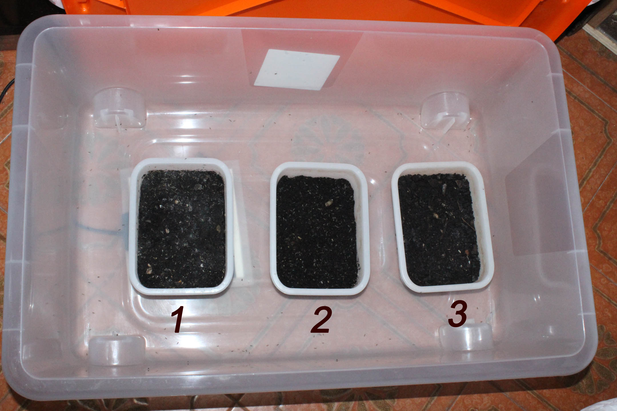 A quel punto sposto il contenitore con le uova in un altro contenitore (contenitore di schiusa) e dagli adulti metto un nuovo contenitore di terra. Ogni contenitore di terra lo numero da 1 a 4 (ne uso solitamente al massimo 4)...così da riuscire a non confonderli e fare la giusta rotazione. I vari contenitori con la terra passeranno quindi 6 settimane nel contenitore di schiusa (tempo sufficiente, quando c'è la giusta temperatura, a far nascere tutti i piccoli grilli). In questo periodo, visto che non fa ancora caldo e la schiusa potrebbe impiegarci di più, uso un piccolo tappetino riscaldante sotto il contenitore più vecchio...così da accellerare i tempi di sviluppo delle uova.